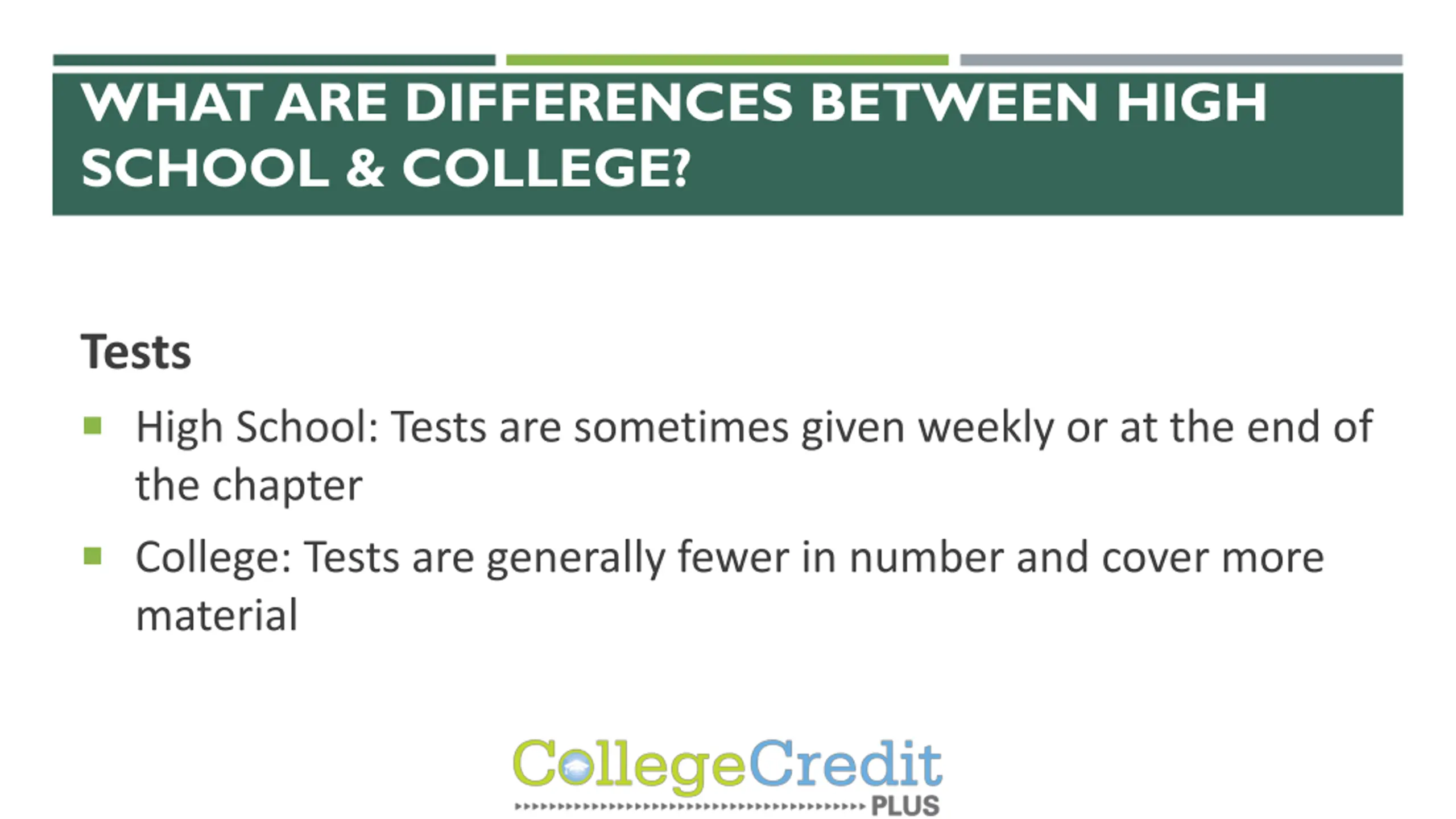 WHAT ARE DIFFERENCES BETWEEN HIGH SCHOOL & COLLEGE? Tests High School: Tests are sometimes given weekly or at the end of the chapter College: Tests are generally fewer in number and cover more material