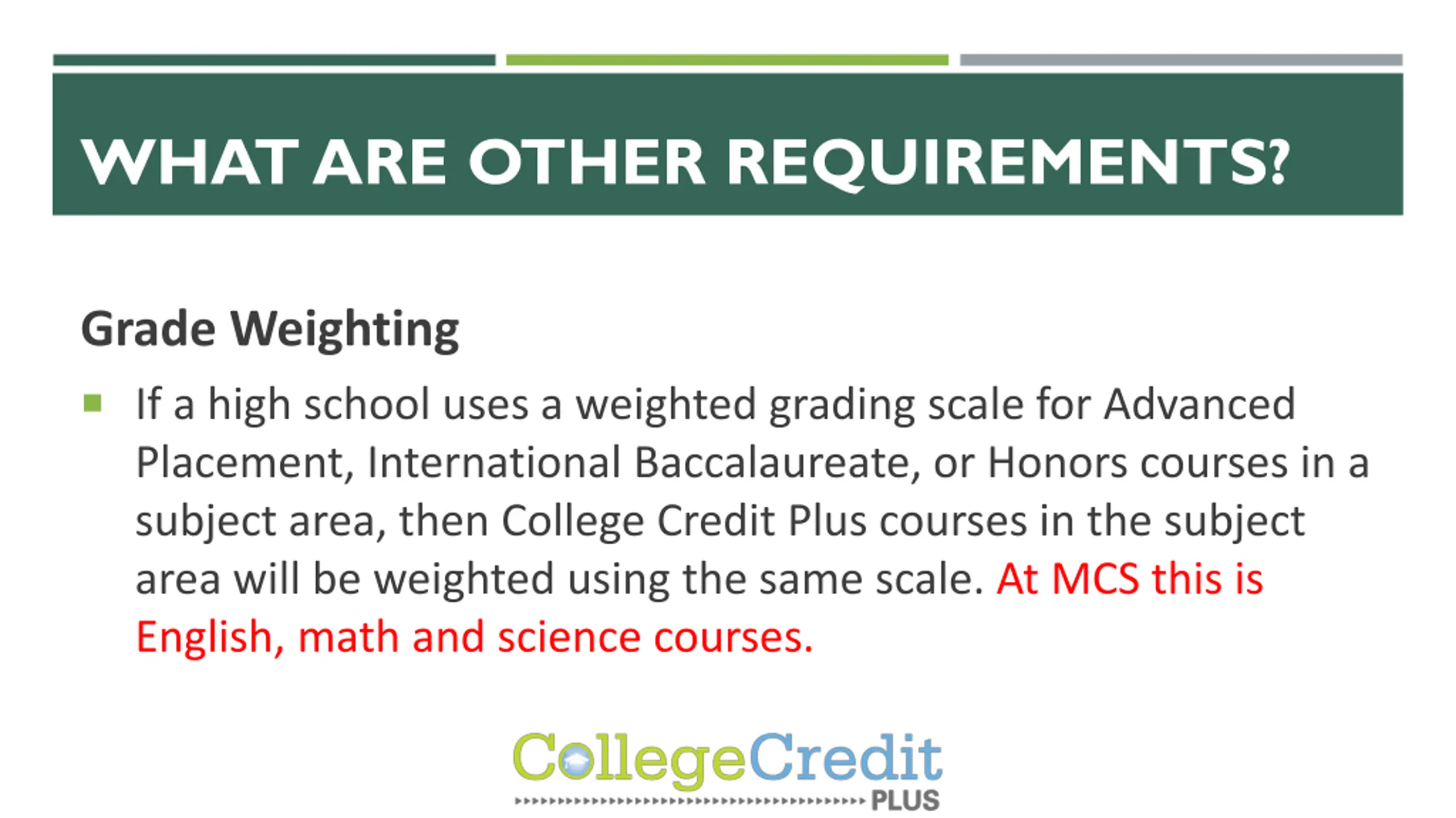 WHAT ARE OTHER REQUIREMENTS? Grade Weighting If a high school uses a weighted grading scale for Advanced Placement, International Baccalaureate, or Honors courses in a subject area, then College Credit Plus courses in the subject area will be weighted using the same scale. At MCS this is English, math and science courses.