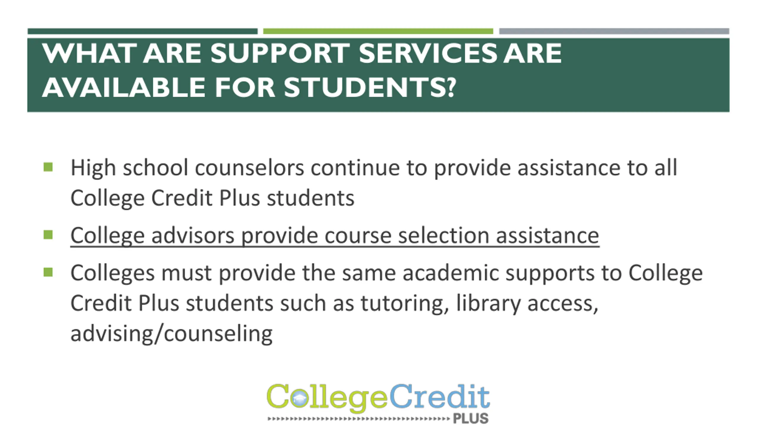 WHAT ARE SUPPORT SERVICES ARE AVAILABLE FOR STUDENTS? High school counselors continue to provide assistance to all College Credit Plus students College advisors provide course selection assistance Colleges must provide the same academic supports to College Credit Plus students such as tutoring, library access, advising/counseling