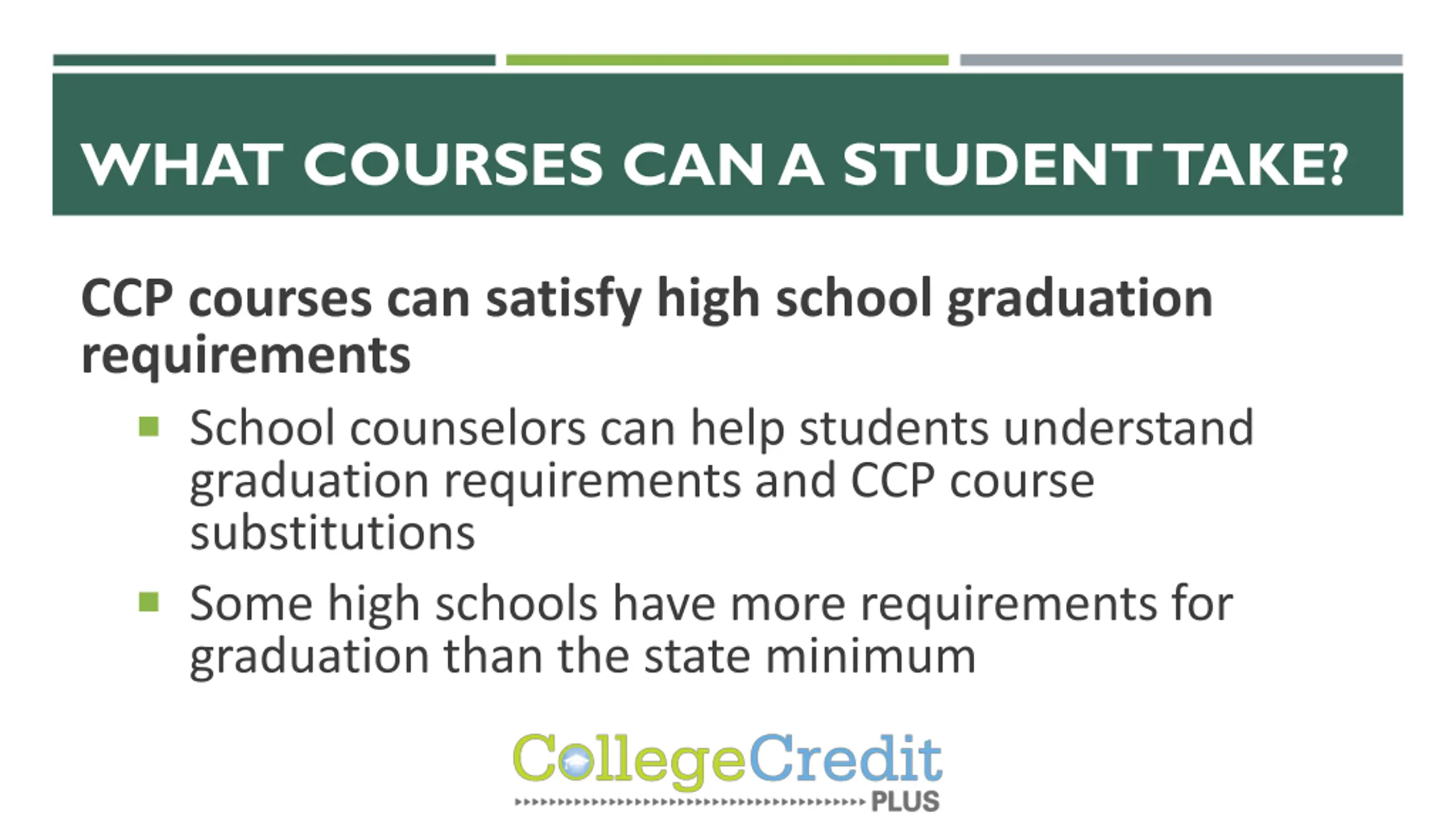 WHAT COURSES CAN A STUDENT TAKE? CCP courses can satisfy high school graduation requirements School counselors can help students understand graduation requirements and CCP course substitutions Some high schools have more requirements for graduation than the state minimum