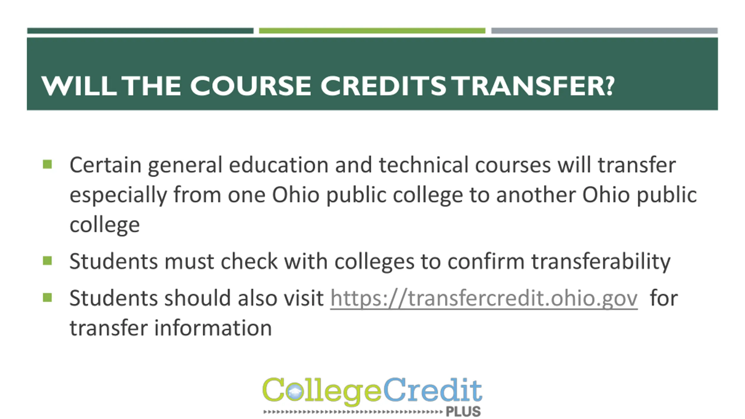 WILL THE COURSE CREDITS TRANSFER? Certain general education and technical courses will transfer especially from one Ohio public college to another Ohio public college Students must check with colleges to confirm transferability Students should also visit https://transfercredit.ohio.gov for transfer information