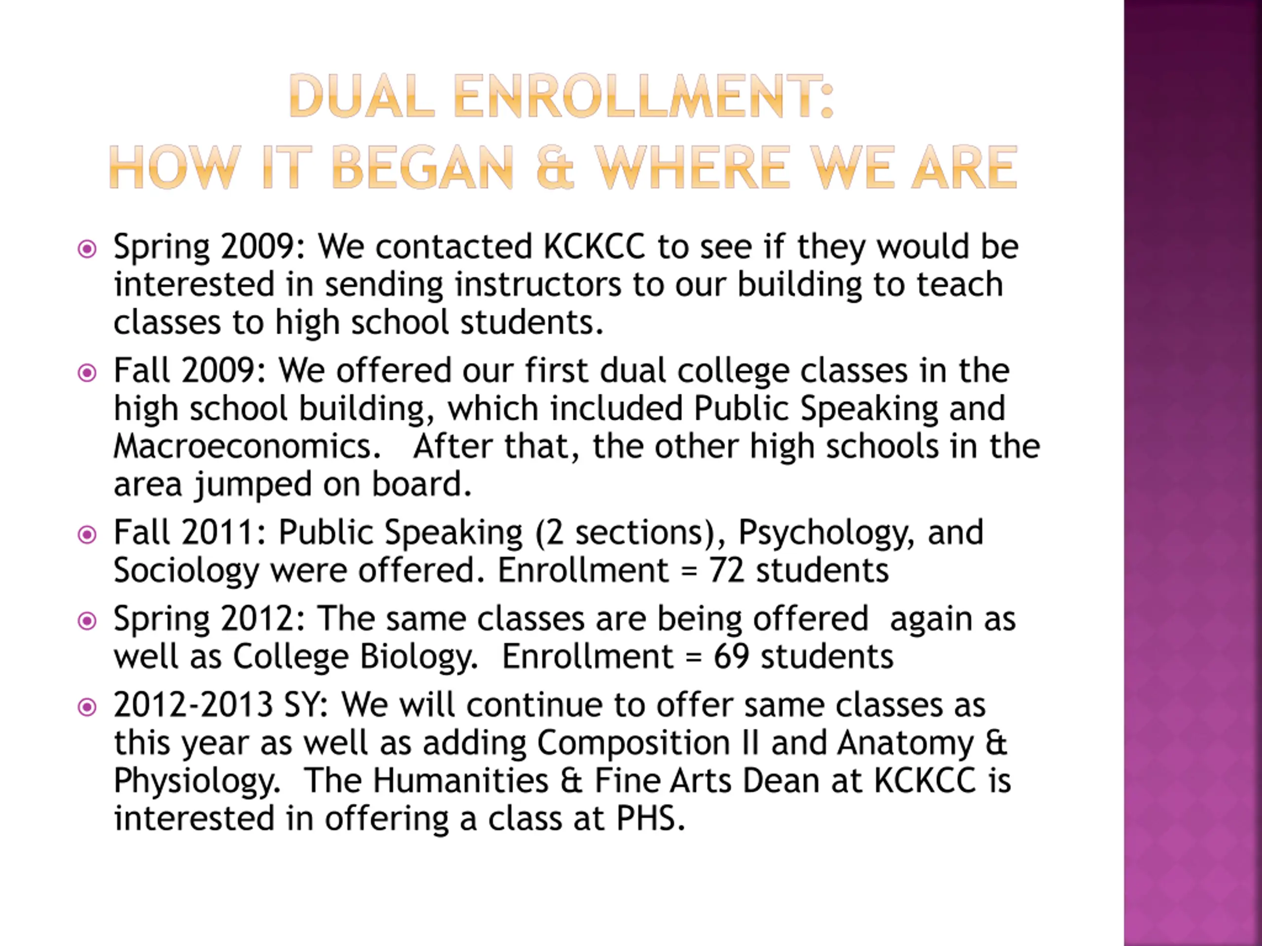 DUAL ENROLLMENT: HOW IT BEGAN & WHERE WE ARE Spring 2009: We contacted KCKCC to see if they would be interested in sending instructors to our building to teach classes to high school students. Fall 2009: We offered our first dual college classes in the high school building, which included Public Speaking and Macroeconomics. After that, the other high schools in the area jumped on board. Fall 2011: Public Speaking (2 sections), Psychology, and Sociology were offered. Enrollment = 72 students Spring 2012: The same classes are being offered again as well as College Biology. Enrollment = 69 students 2012-2013 SY: We will continue to offer same classes as this year as well as adding Composition II and Anatomy & Physiology. The Humanities & Fine Arts Dean at KCKCC is interested in offering a class at PHS.