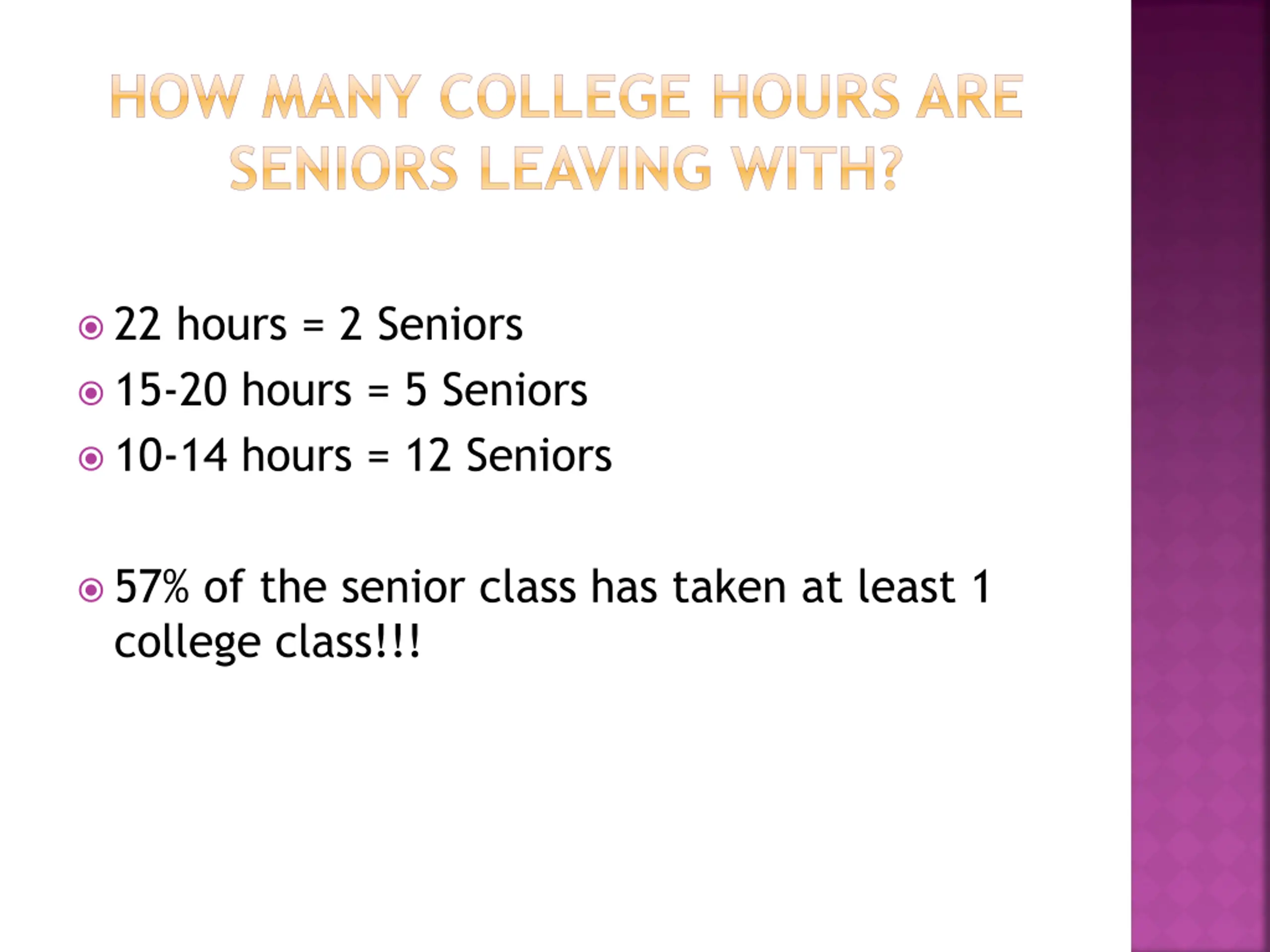 HOW MANY COLLEGE HOURS ARE SENIORS LEAVING WITH? 22 hours = 2 Seniors 15-20 hours = 5 Seniors 10-14 hours = 12 Seniors 57% of the senior class has taken at least 1 college class!!!