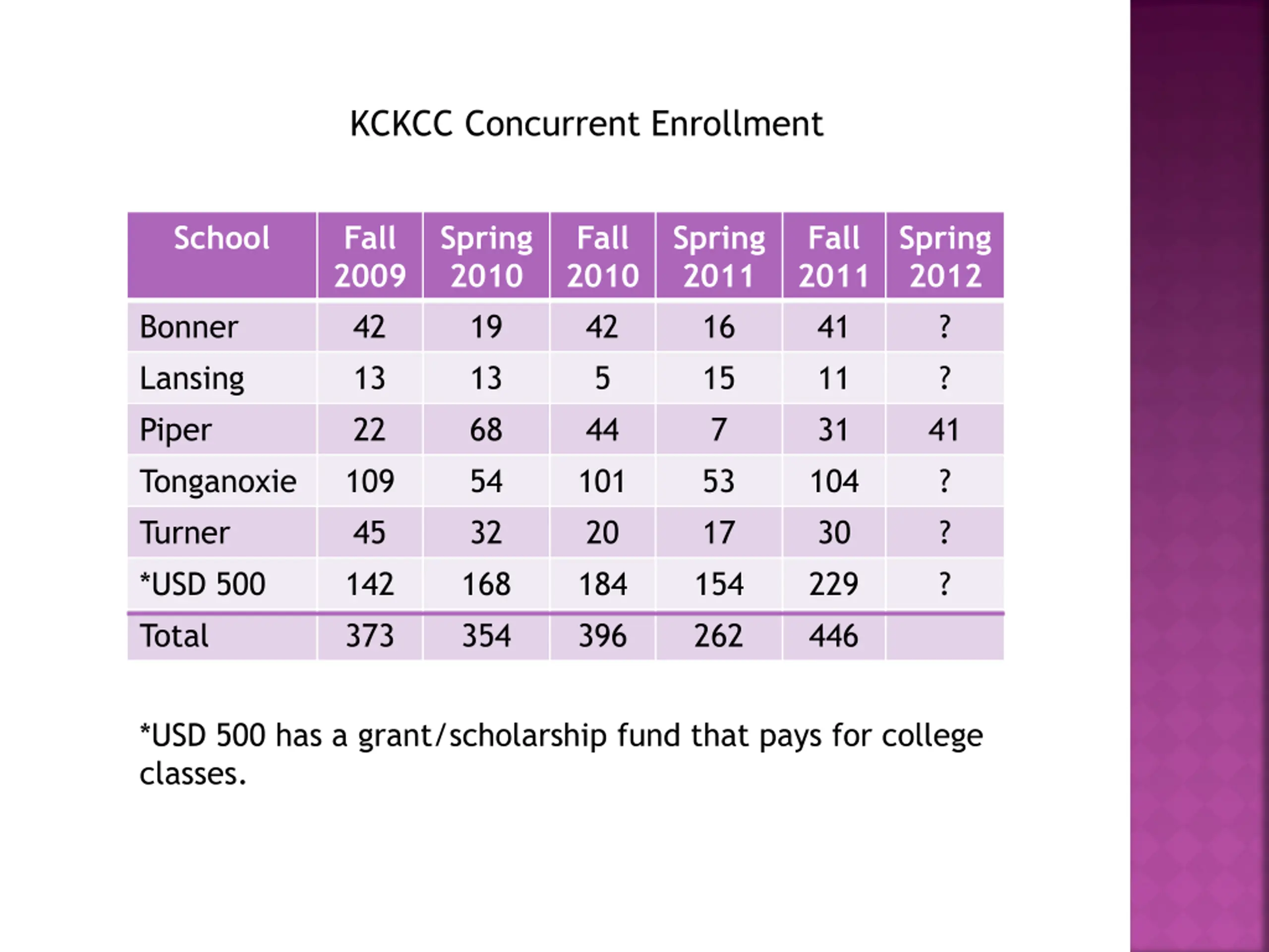 KCKCC Concurrent Enrollment School Fall 2009 42 13 22 109 45 142 373 Spring 2010 19 13 68 54 32 168 354 Fall 2010 42 5 44 101 20 184 396 Spring 2011 16 15 7 53 17 154 262 Fall 2011 41 11 31 104 30 229 446 Spring 2012 ? ? 41 ? ? ? Bonner Lansing Piper Tonganoxie Turner *USD 500 Total *USD 500 has a grant/scholarship fund that pays for college classes.
