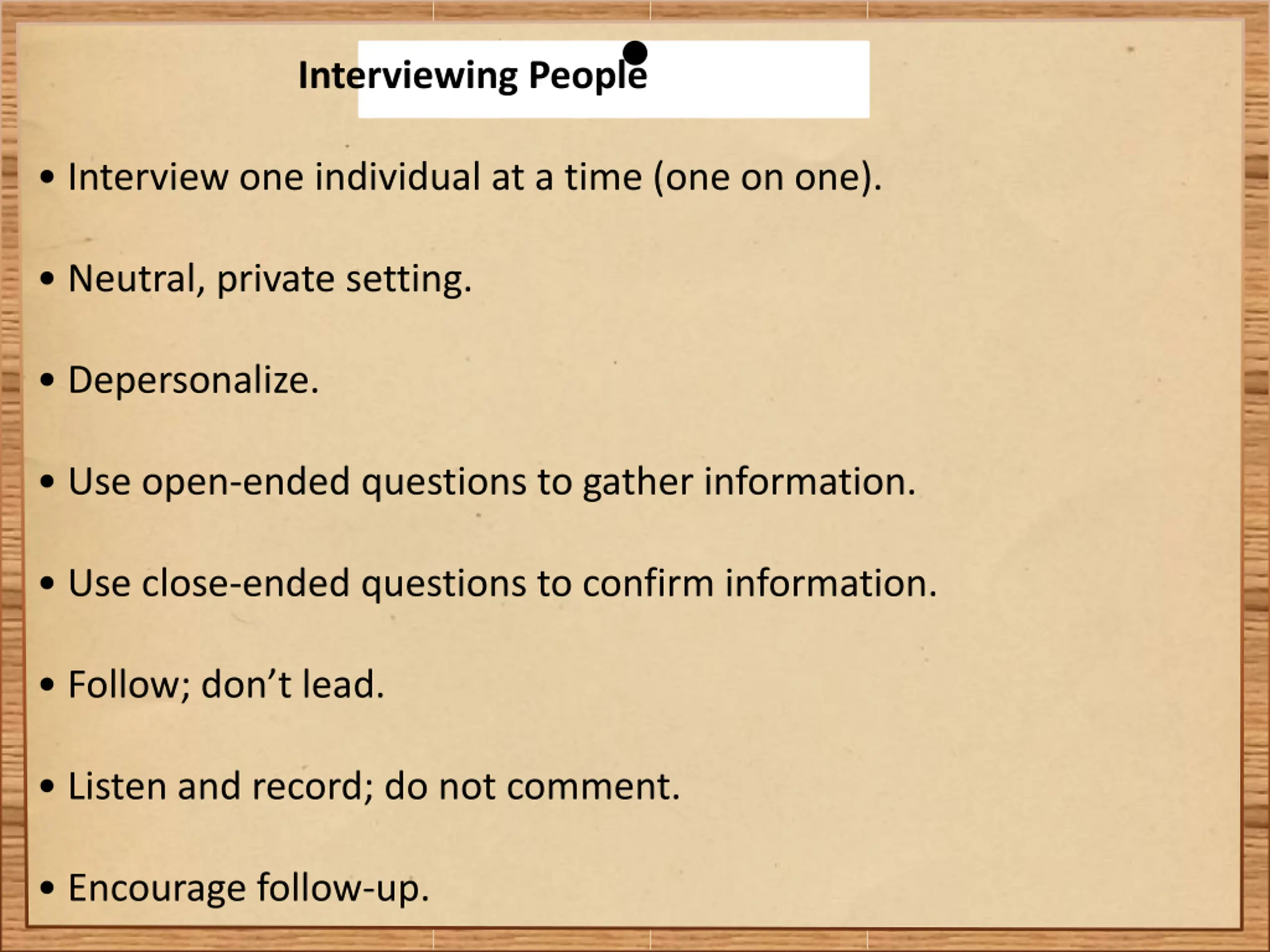 Interviewing People Interview one individual at a time (one on one). Neutral, private setting. Depersonalize. Use open-ended questions to gather information. Use close-ended questions to confirm information. Follow; don t lead. Listen and record; do not comment. Encourage follow-up.