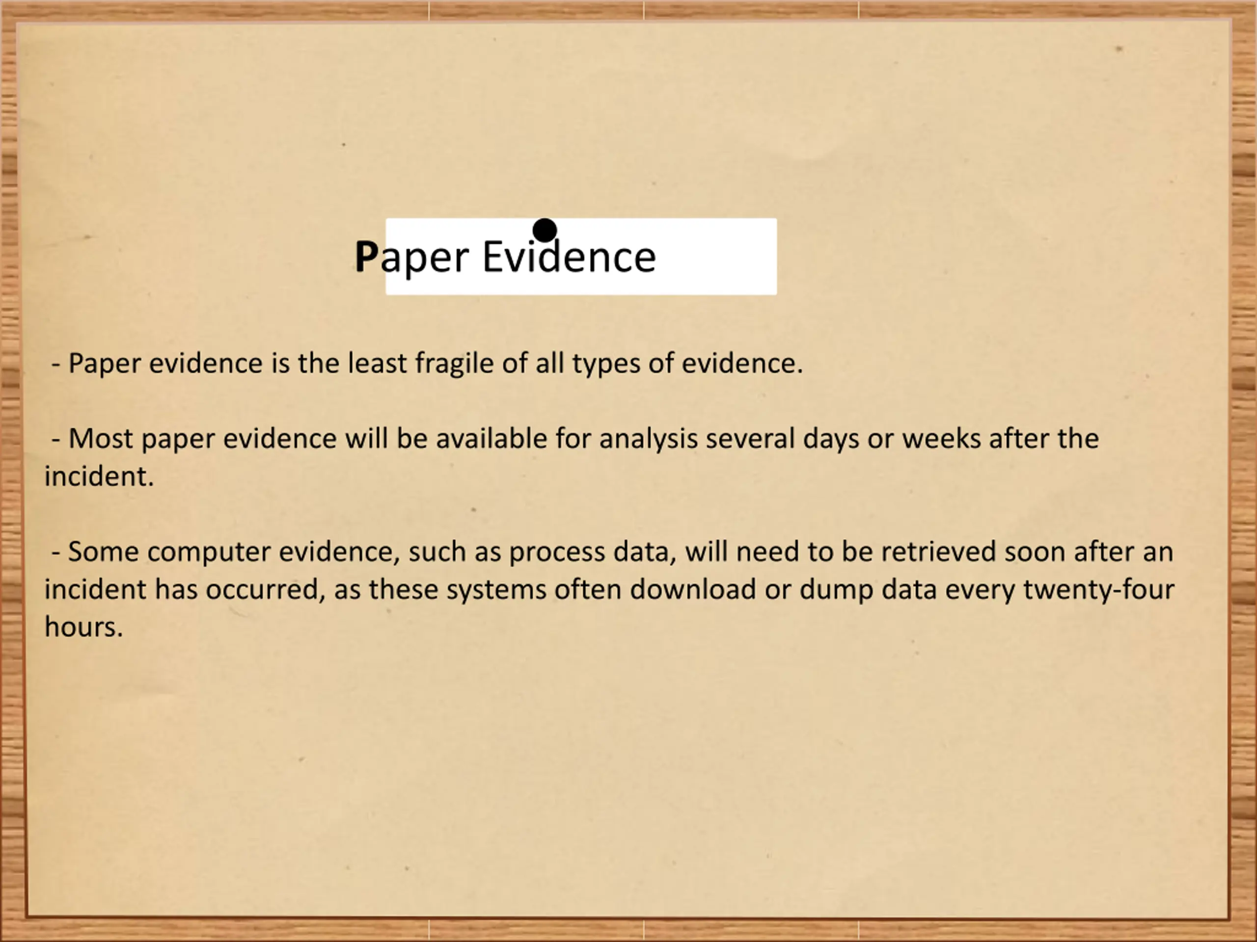 Paper Evidence - Paper evidence is the least fragile of all types of evidence. - Most paper evidence will be available for analysis several days or weeks after the incident. - Some computer evidence, such as process data, will need to be retrieved soon after an incident has occurred, as these systems often download or dump data every twenty-four hours.