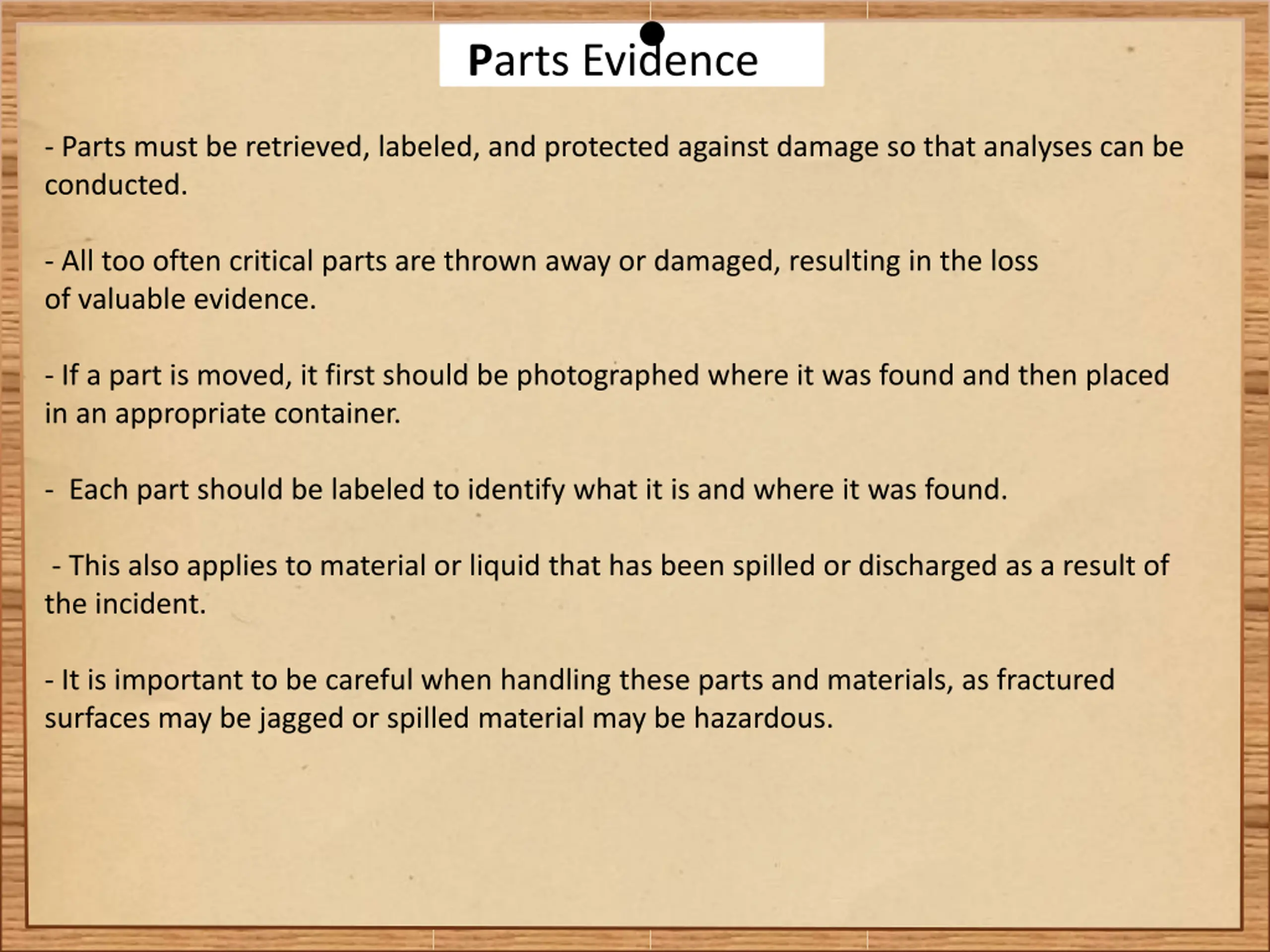 Parts Evidence - Parts must be retrieved, labeled, and protected against damage so that analyses can be conducted. - All too often critical parts are thrown away or damaged, resulting in the loss of valuable evidence. - If a part is moved, it first should be photographed where it was found and then placed in an appropriate container. - Each part should be labeled to identify what it is and where it was found. - This also applies to material or liquid that has been spilled or discharged as a result of the incident. - It is important to be careful when handling these parts and materials, as fractured surfaces may be jagged or spilled material may be hazardous.