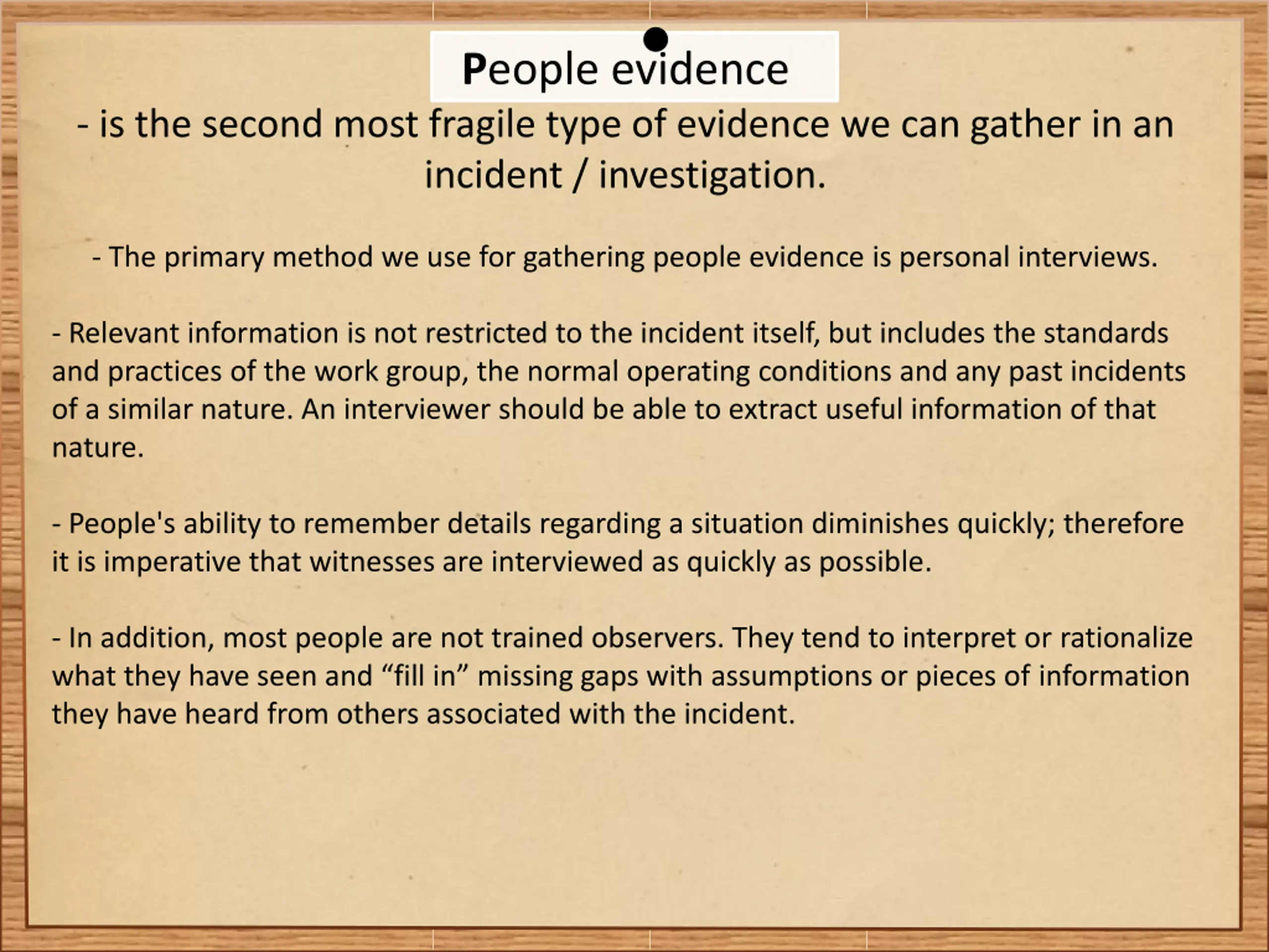 People evidence - is the second most fragile type of evidence we can gather in an incident / investigation. - The primary method we use for gathering people evidence is personal interviews. - Relevant information is not restricted to the incident itself, but includes the standards and practices of the work group, the normal operating conditions and any past incidents of a similar nature. An interviewer should be able to extract useful information of that nature. - People's ability to remember details regarding a situation diminishes quickly; therefore it is imperative that witnesses are interviewed as quickly as possible. - In addition, most people are not trained observers. They tend to interpret or rationalize what they have seen and fill in missing gaps with assumptions or pieces of information they have heard from others associated with the incident.