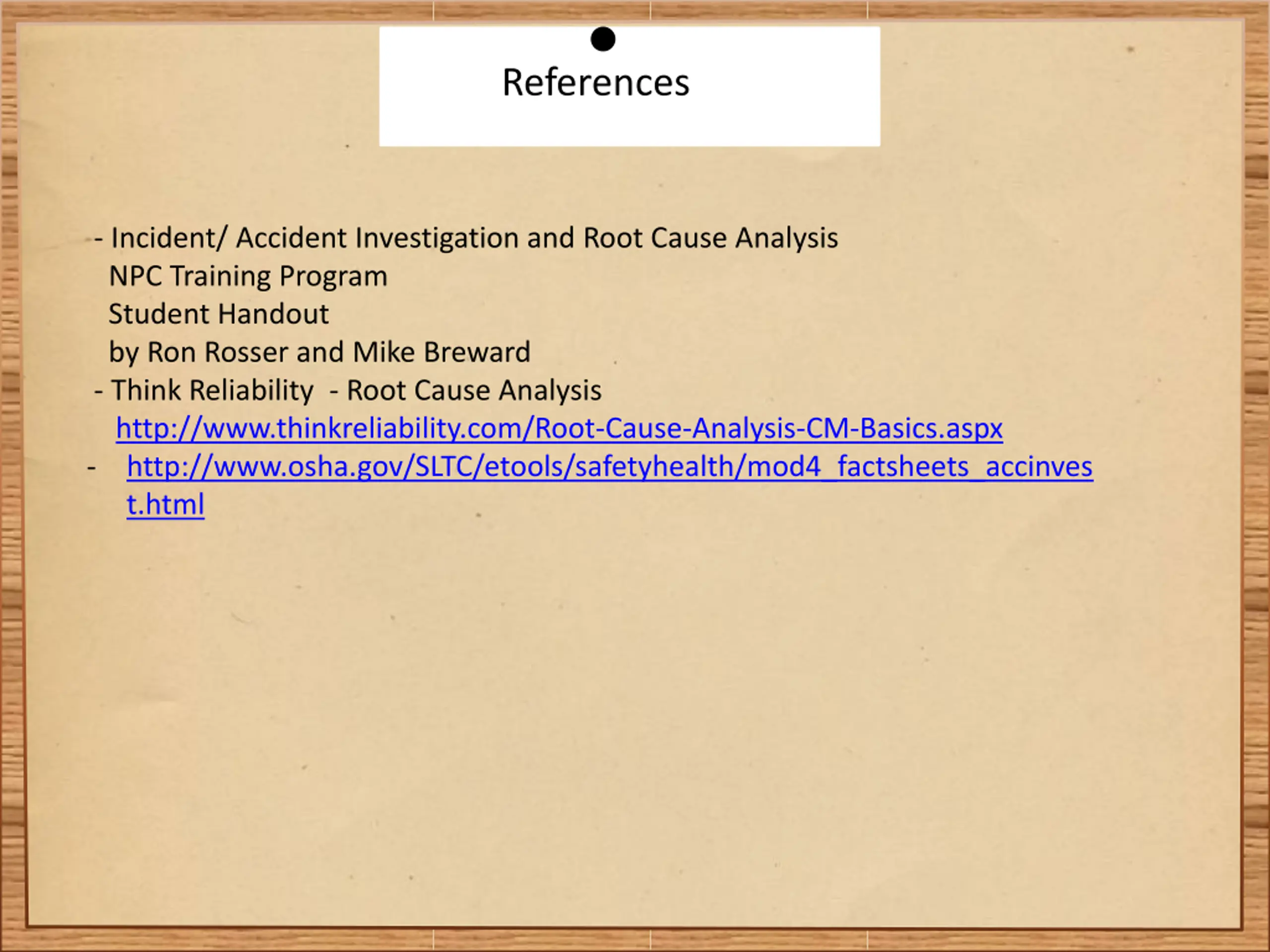 References - Incident/ Accident Investigation and Root Cause Analysis NPC Training Program Student Handout by Ron Rosser and Mike Breward - Think Reliability - Root Cause Analysis http://www.thinkreliability.com/Root-Cause-Analysis-CM-Basics.aspx - http://www.osha.gov/SLTC/etools/safetyhealth/mod4_factsheets_accinves t.html