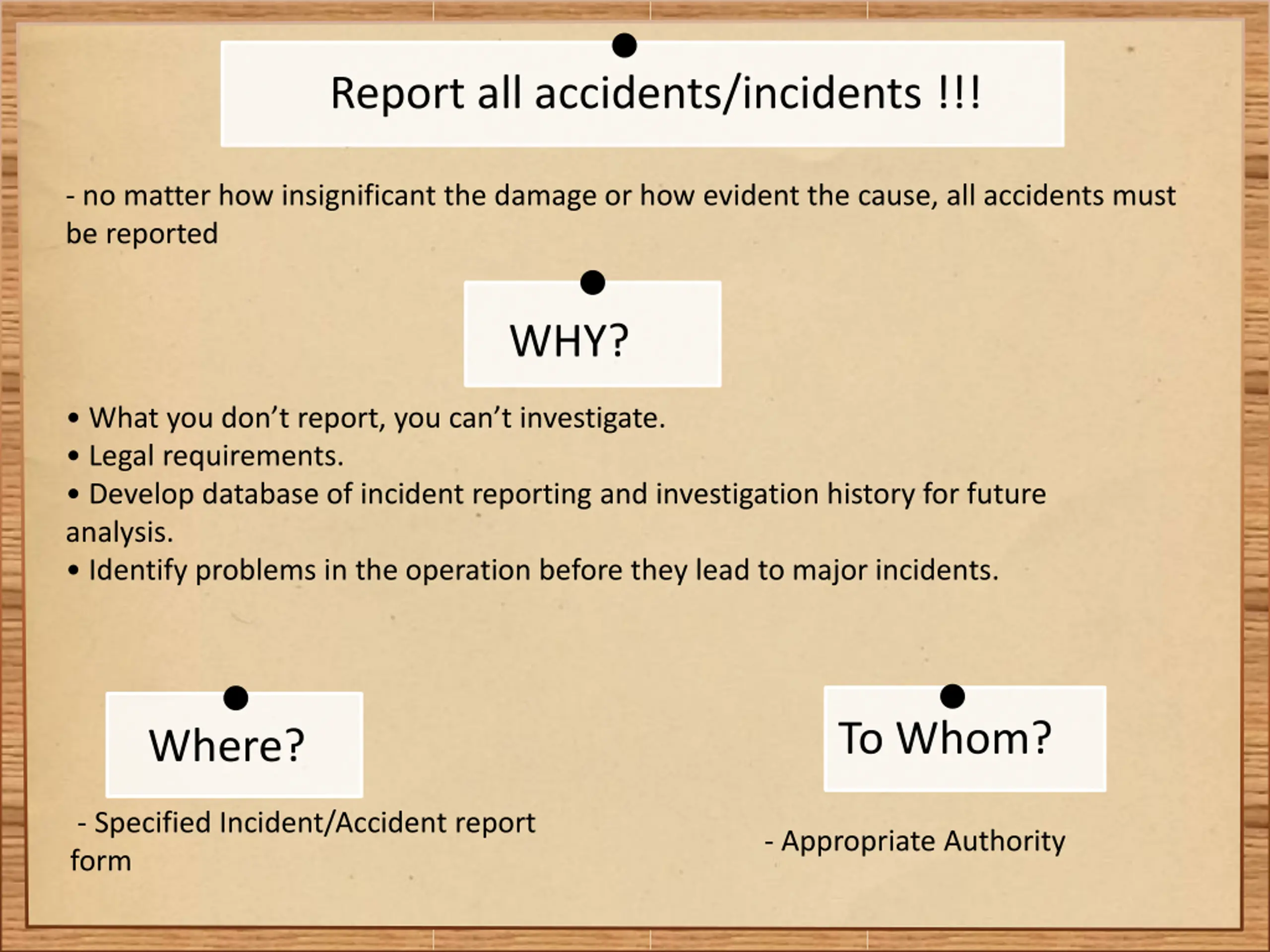 Report all accidents/incidents !!! - no matter how insignificant the damage or how evident the cause, all accidents must be reported WHY? What you don t report, you can t investigate. Legal requirements. Develop database of incident reporting and investigation history for future analysis. Identify problems in the operation before they lead to major incidents. To Whom? Where? - Specified Incident/Accident report form - Appropriate Authority
