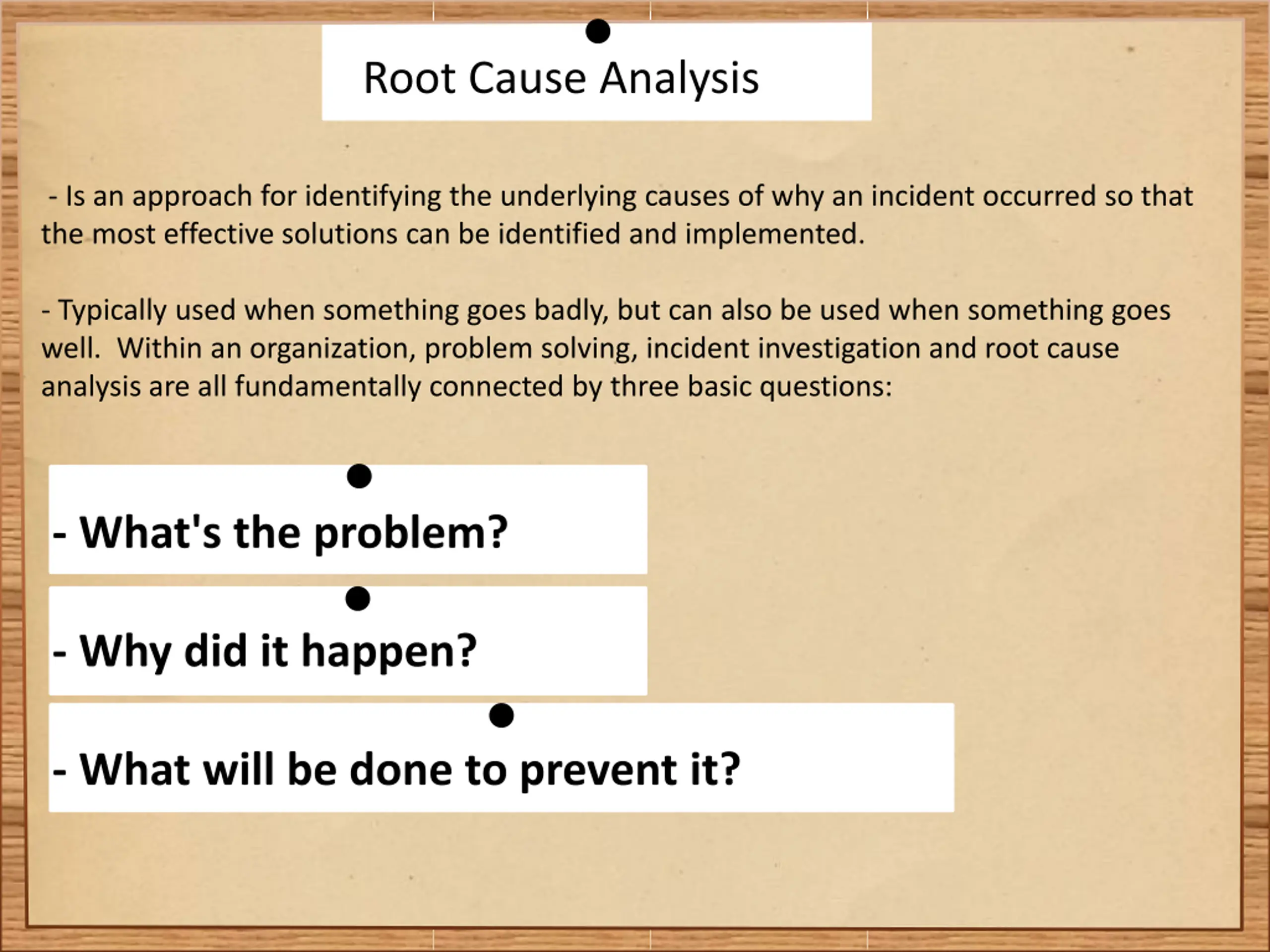 Root Cause Analysis - Is an approach for identifying the underlying causes of why an incident occurred so that the most effective solutions can be identified and implemented. - Typically used when something goes badly, but can also be used when something goes well. Within an organization, problem solving, incident investigation and root cause analysis are all fundamentally connected by three basic questions: - What's the problem? - Why did it happen? - What will be done to prevent it?