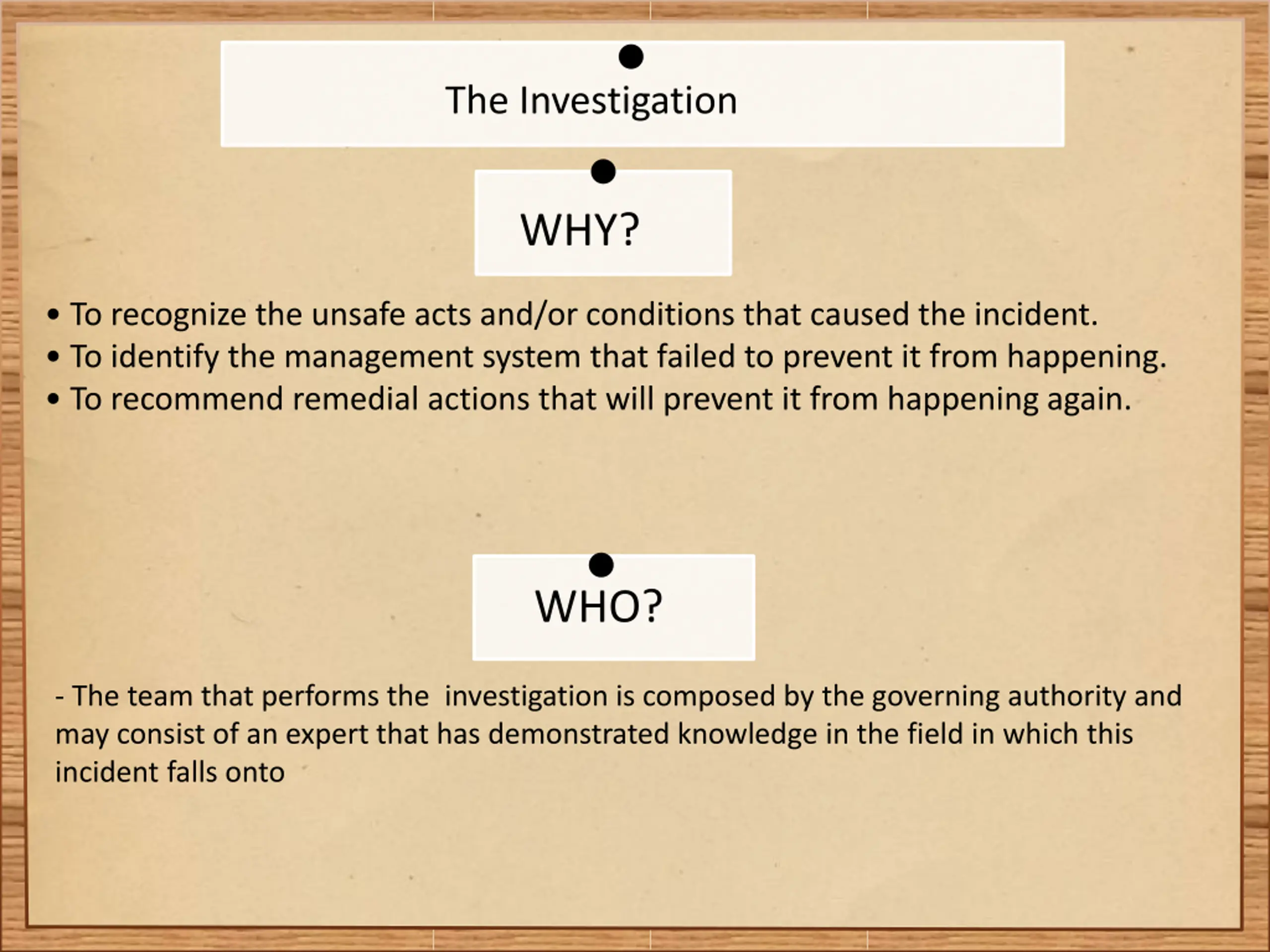 The Investigation WHY? To recognize the unsafe acts and/or conditions that caused the incident. To identify the management system that failed to prevent it from happening. To recommend remedial actions that will prevent it from happening again. WHO? - The team that performs the investigation is composed by the governing authority and may consist of an expert that has demonstrated knowledge in the field in which this incident falls onto