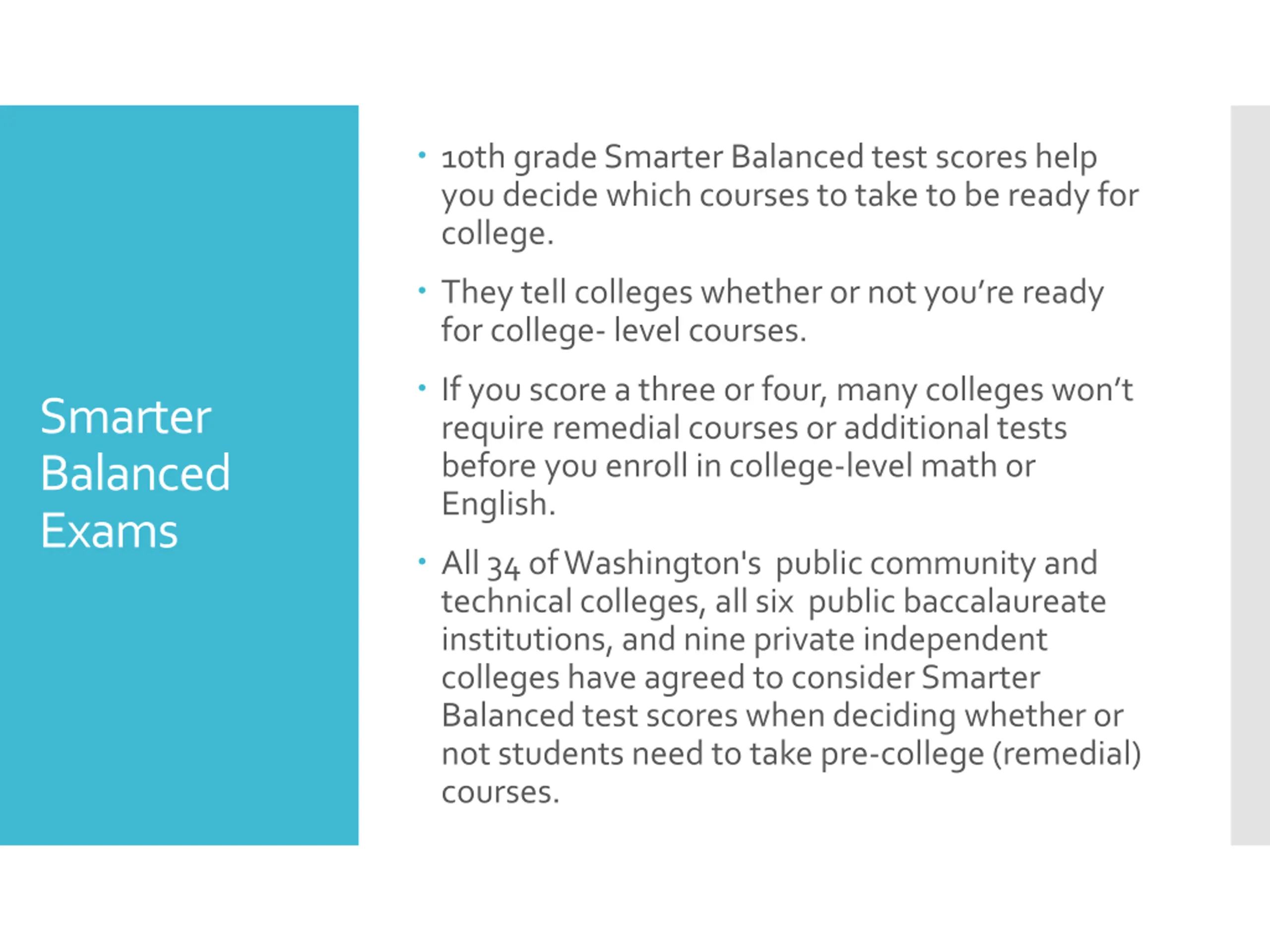 10th grade Smarter Balanced test scores help you decide which courses to take to be ready for college. They tell colleges whether or not you re ready for college-level courses. If you score a three or four, many colleges won t require remedial courses or additional tests before you enroll in college-level math or English. Smarter Balanced Exams All 34 of Washington's public community and technical colleges, all six public baccalaureate institutions, and nine private independent colleges have agreed to consider Smarter Balanced test scores when deciding whether or not students need to take pre-college (remedial) courses.