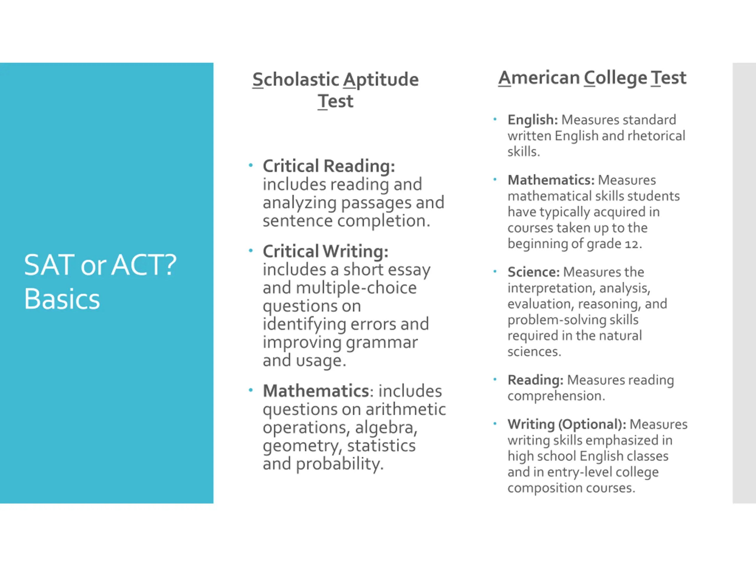 American College Test Scholastic Aptitude Test English: Measures standard written English and rhetorical skills. Critical Reading: includes reading and analyzing passages and sentence completion. Mathematics: Measures mathematical skills students have typically acquired in courses taken up to the beginning of grade 12. Critical Writing: includes a short essay and multiple-choice questions on identifying errors and improving grammar and usage. SAT or ACT? Basics Science: Measures the interpretation, analysis, evaluation, reasoning, and problem-solving skills required in the natural sciences. Reading: Measures reading comprehension. Mathematics: includes questions on arithmetic operations, algebra, geometry, statistics and probability. Writing (Optional): Measures writing skills emphasized in high school English classes and in entry-level college composition courses.