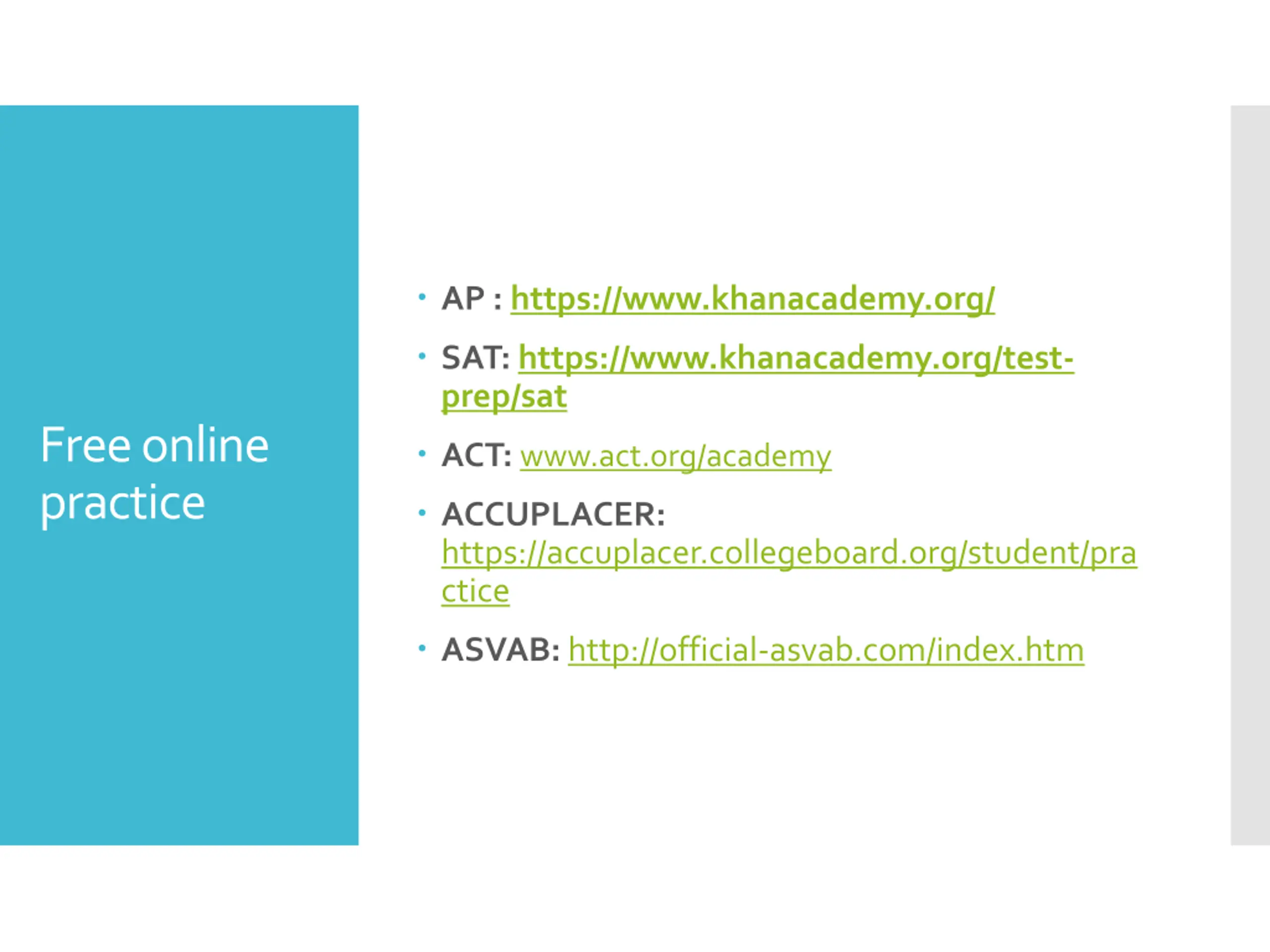 AP : https://www.khanacademy.org/ SAT: https://www.khanacademy.org/test- prep/sat Free online practice ACT: www.act.org/academy ACCUPLACER: https://accuplacer.collegeboard.org/student/pra ctice ASVAB: http://official-asvab.com/index.htm