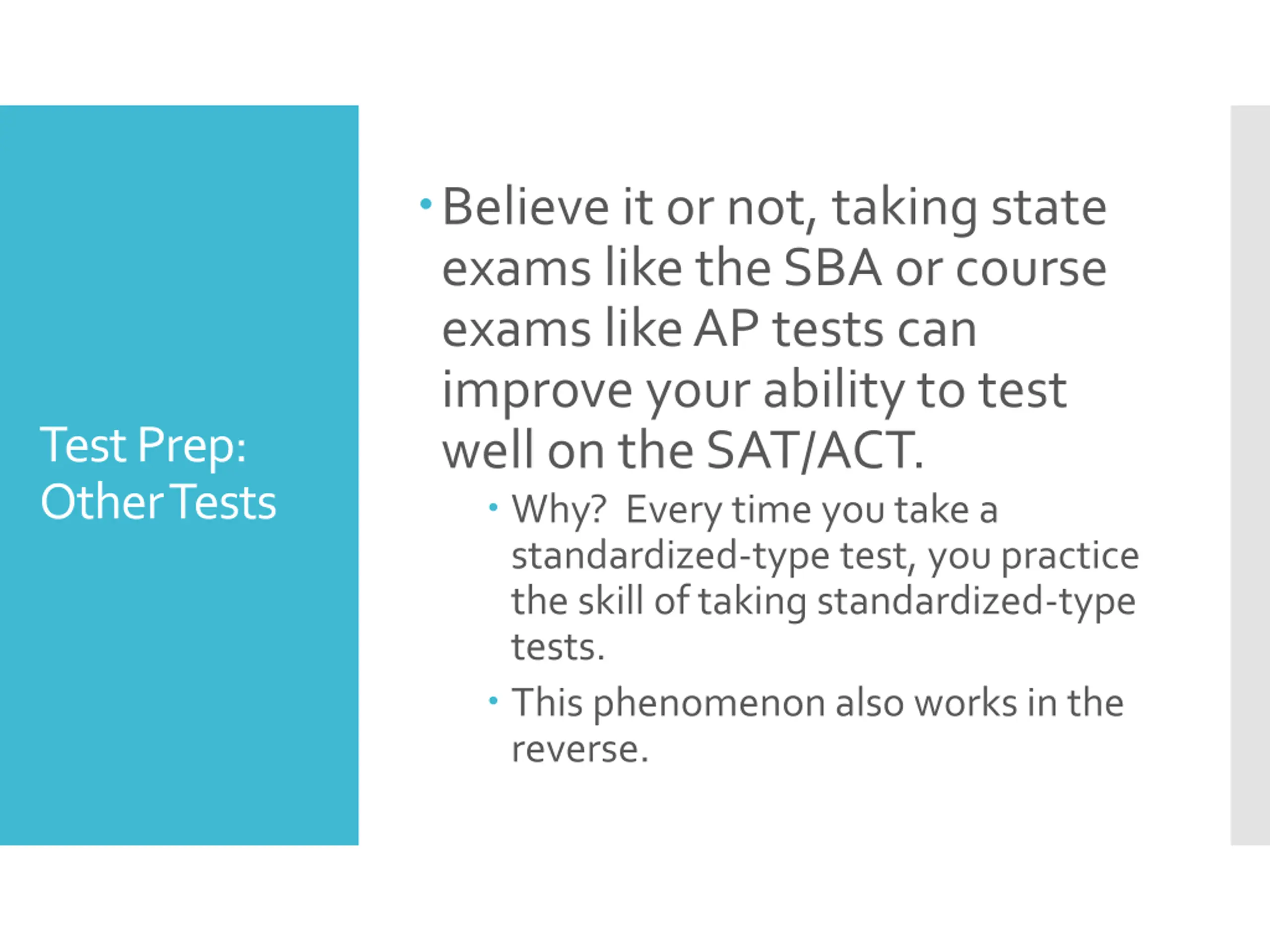 Believe it or not, taking state exams like the SBA or course exams like AP tests can improve your ability to test well on the SAT/ACT. Why? Every time you take a standardized-type test, you practice the skill of taking standardized-type tests. This phenomenon also works in the reverse. Test Prep: Other Tests
