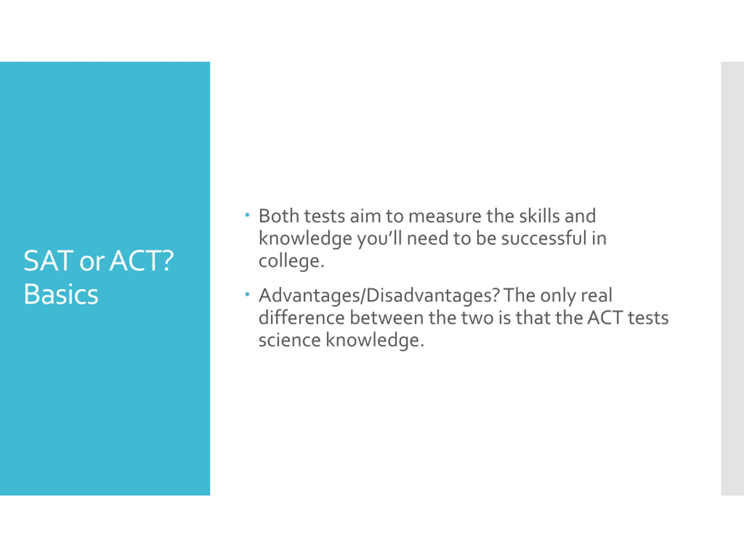 Both tests aim to measure the skills and knowledge you ll need to be successful in college. SAT or ACT? Basics Advantages/Disadvantages? The only real difference between the two is that the ACT tests science knowledge.