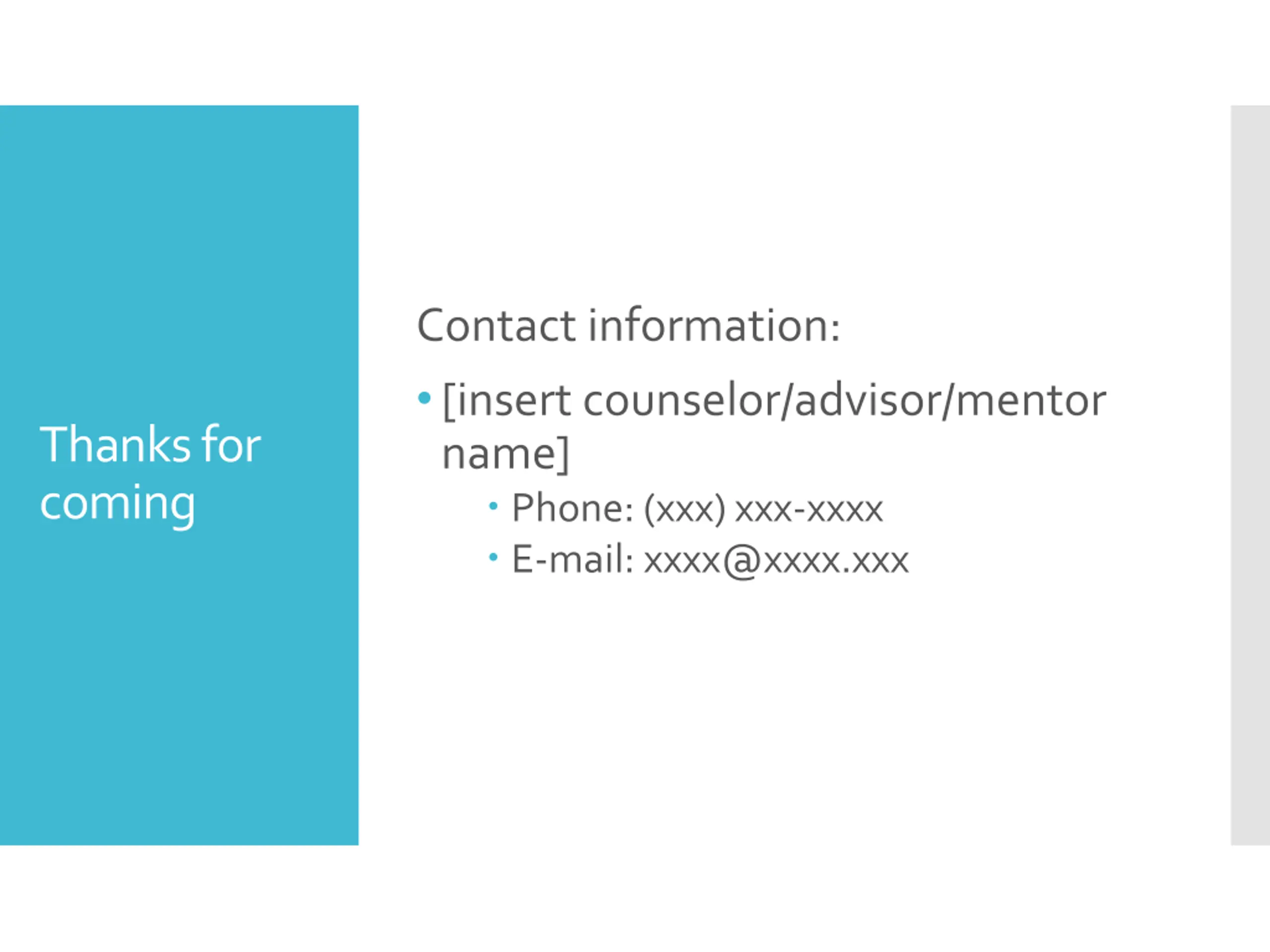 Contact information: [insert counselor/advisor/mentor name] Phone: (xxx) xxx-xxxx E-mail: xxxx@xxxx.xxx Thanks for coming