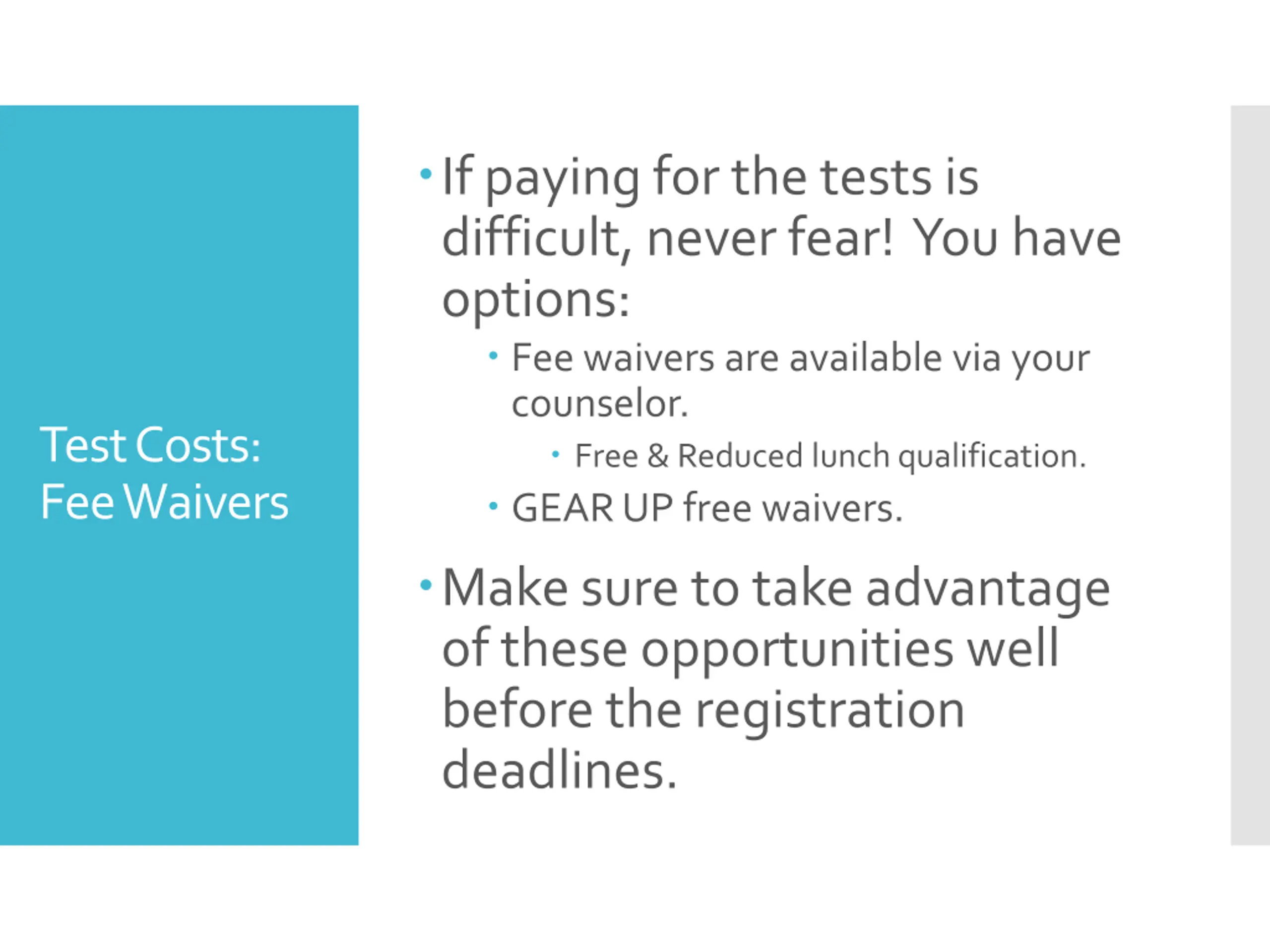If paying for the tests is difficult, never fear! You have options: Fee waivers are available via your counselor. Free & Reduced lunch qualification. GEAR UP free waivers. Make sure to take advantage of these opportunities well before the registration deadlines. Test Costs: Fee Waivers