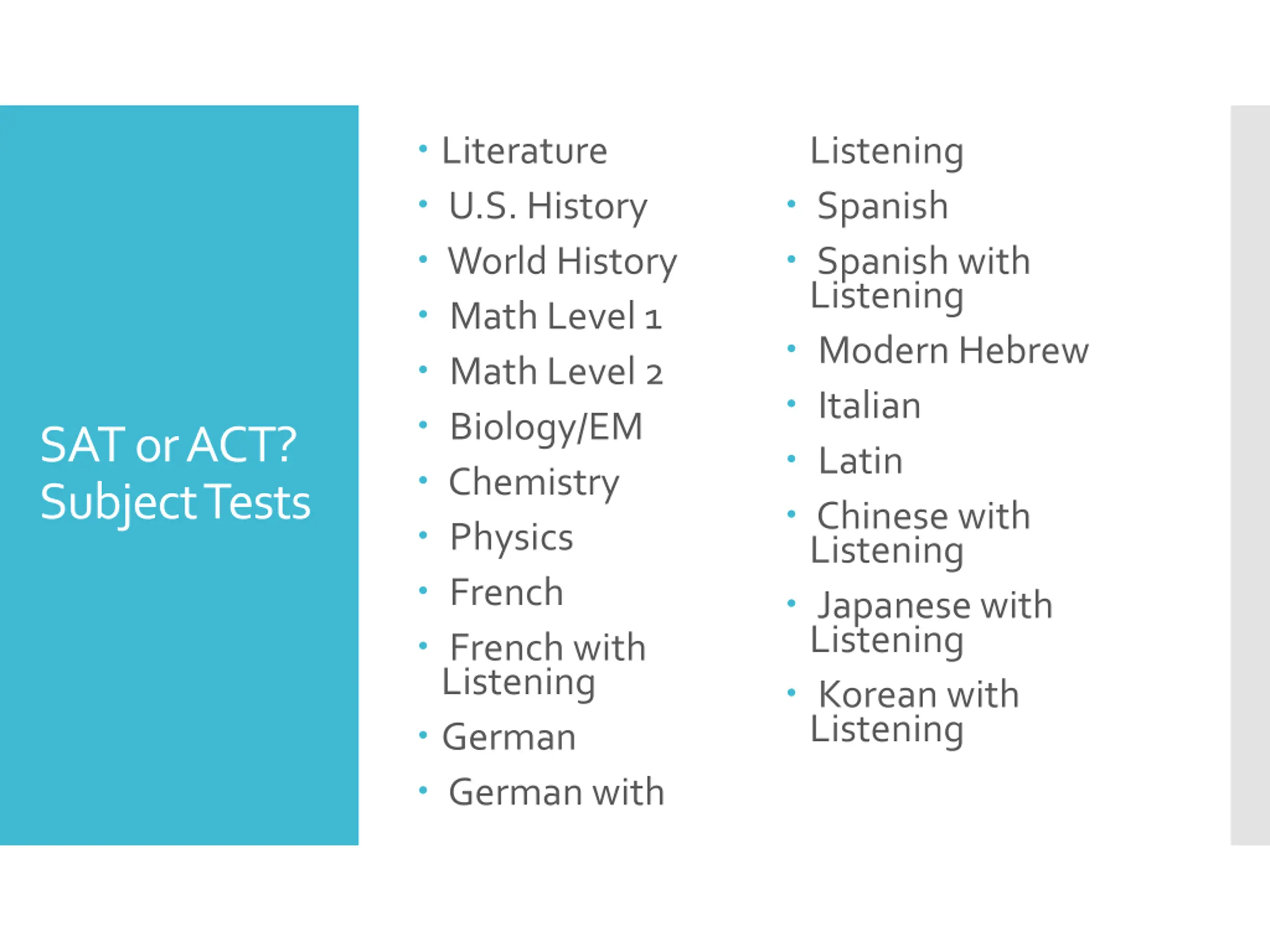 Literature U.S. History World History Math Level 1 Math Level 2 Biology/EM Chemistry Physics French French with Listening German German with Listening Spanish Spanish with Listening Modern Hebrew Italian Latin Chinese with Listening Japanese with Listening Korean with Listening SAT or ACT? Subject Tests