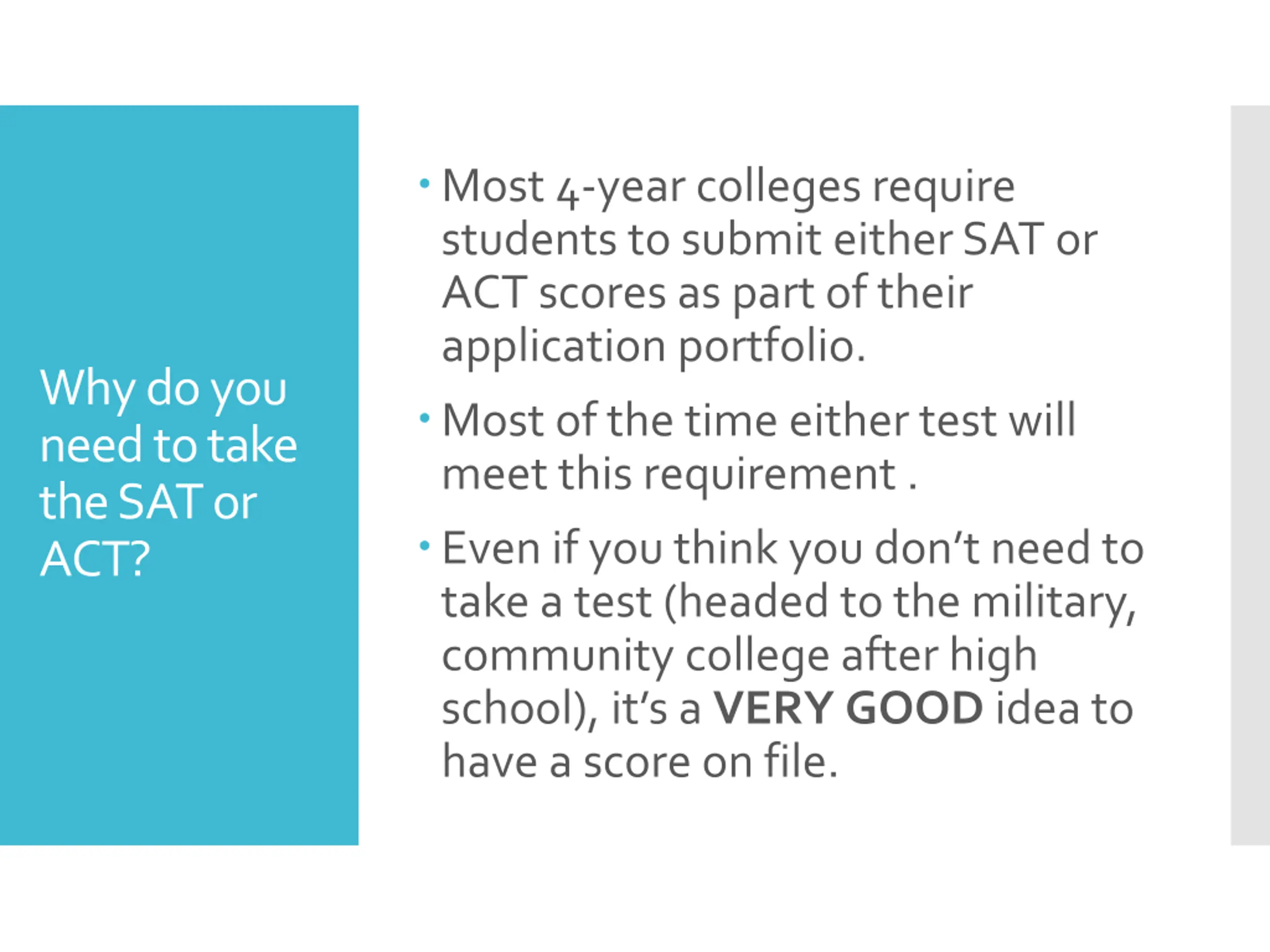Most 4-year colleges require students to submit either SAT or ACT scores as part of their application portfolio. Most of the time either test will meet this requirement . Even if you think you don t need to take a test (headed to the military, community college after high school), it s a VERY GOOD idea to have a score on file. Why do you need to take the SAT or ACT?