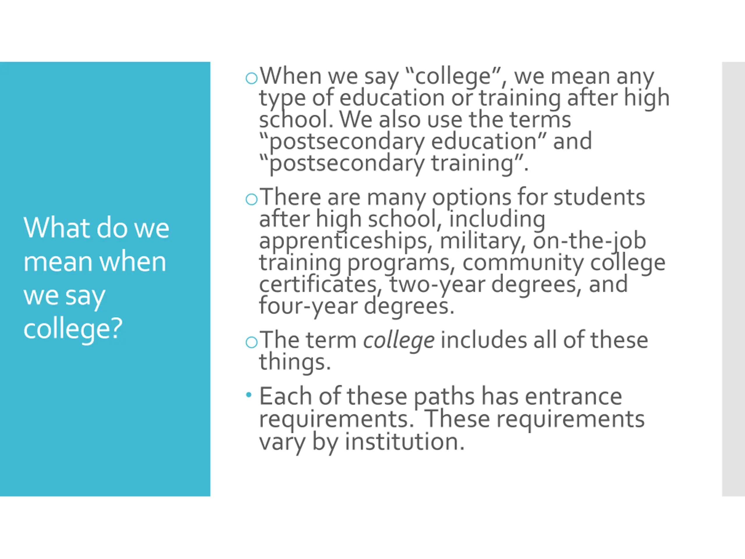 oWhen we say college, we mean any type of education or training after high school. We also use the terms postsecondary education and postsecondary training . oThere are many options for students after high school, including apprenticeships, military, on-the-job training programs, community college certificates, two-year degrees, and four-year degrees. oThe term college includes all of these things. Each of these paths has entrance requirements. These requirements vary by institution. What do we mean when we say college?