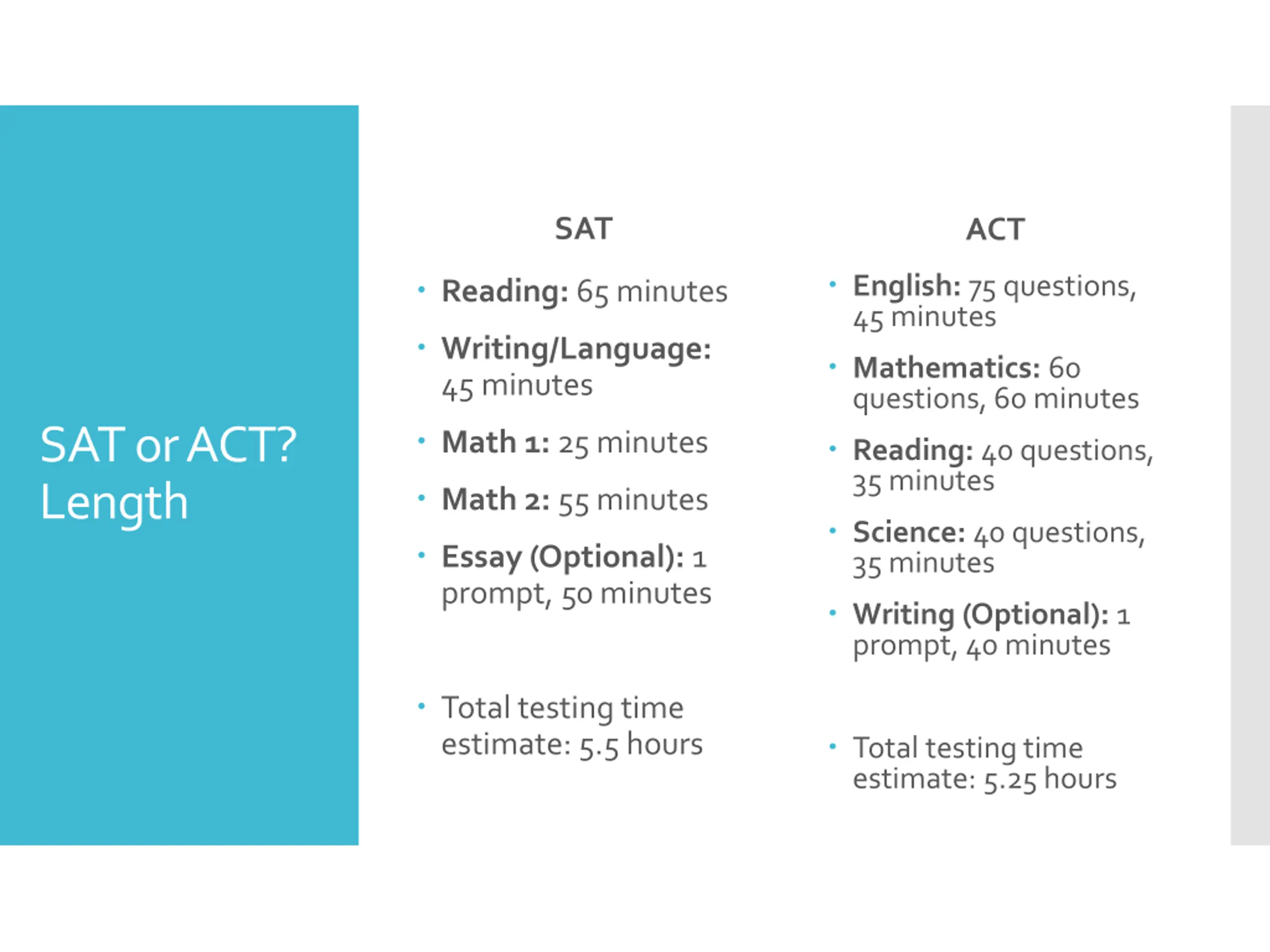 SAT ACT English: 75 questions, 45 minutes Reading: 65 minutes Writing/Language: 45 minutes Mathematics: 60 questions, 60 minutes SAT or ACT? Length Math 1: 25 minutes Reading: 40 questions, 35 minutes Math 2: 55 minutes Science: 40 questions, 35 minutes Essay (Optional): 1 prompt, 50 minutes Writing (Optional): 1 prompt, 40 minutes Total testing time estimate: 5.5 hours Total testing time estimate: 5.25 hours