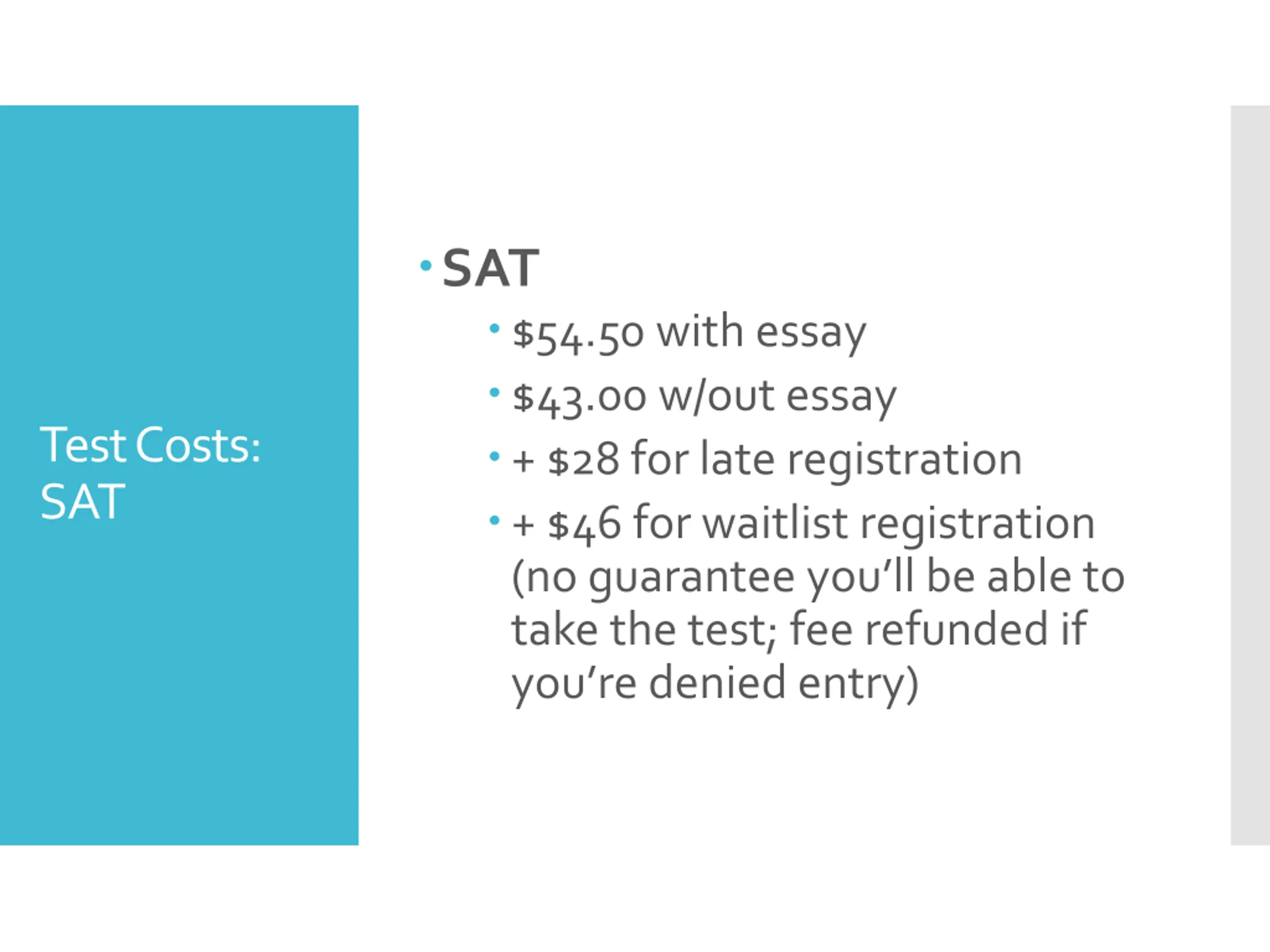 SAT $54.50 with essay $43.00 w/out essay + $28 for late registration + $46 for waitlist registration (no guarantee you ll be able to take the test; fee refunded if you re denied entry) Test Costs: SAT
