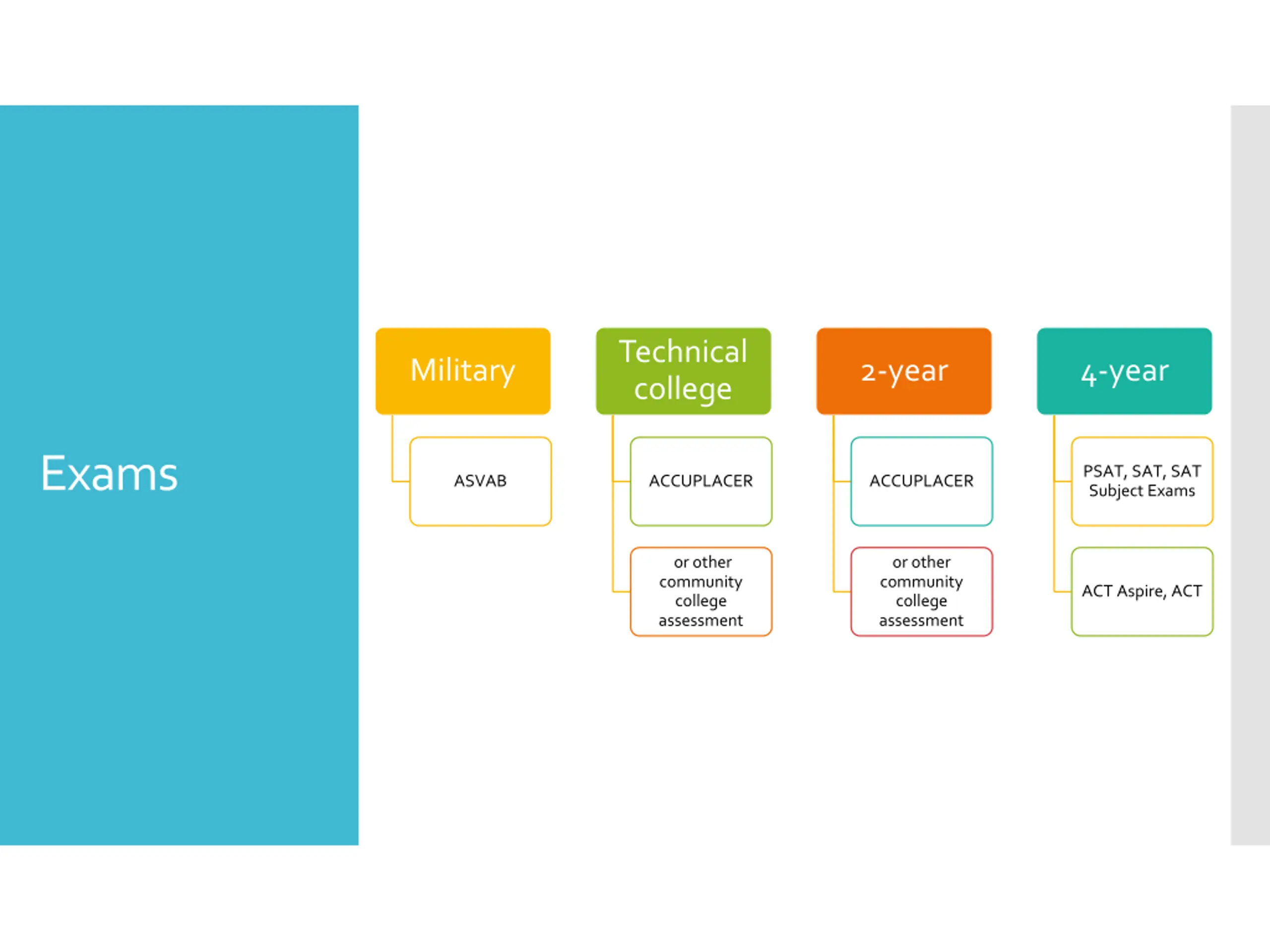 Technical college Military 2-year 4-year Exams PSAT, SAT, SAT Subject Exams ASVAB ACCUPLACER ACCUPLACER or other community college assessment or other community college assessment ACT Aspire, ACT
