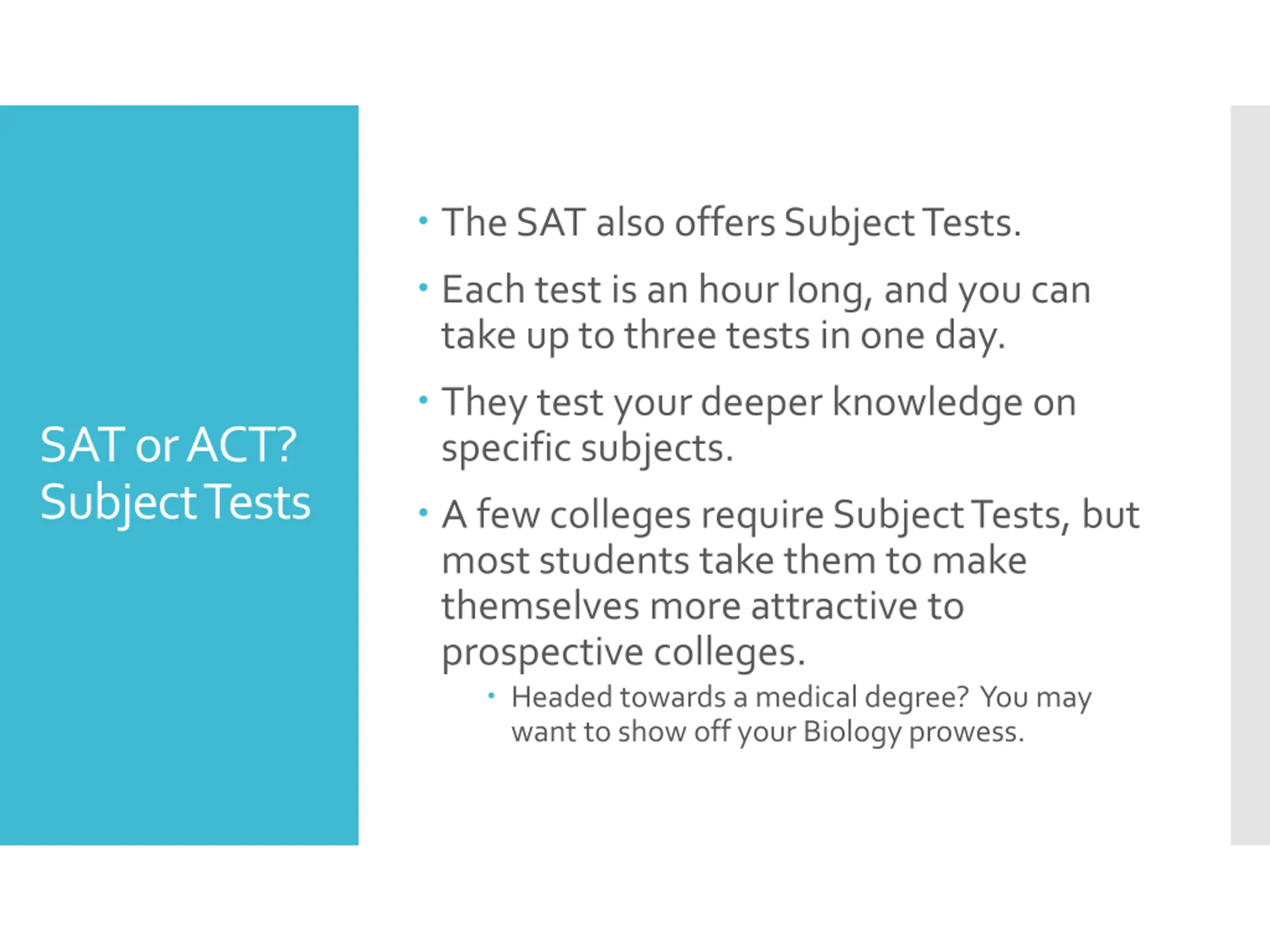 The SAT also offers Subject Tests. Each test is an hour long, and you can take up to three tests in one day. They test your deeper knowledge on specific subjects. A few colleges require Subject Tests, but most students take them to make themselves more attractive to prospective colleges. Headed towards a medical degree? You may want to show off your Biology prowess. SAT or ACT? Subject Tests