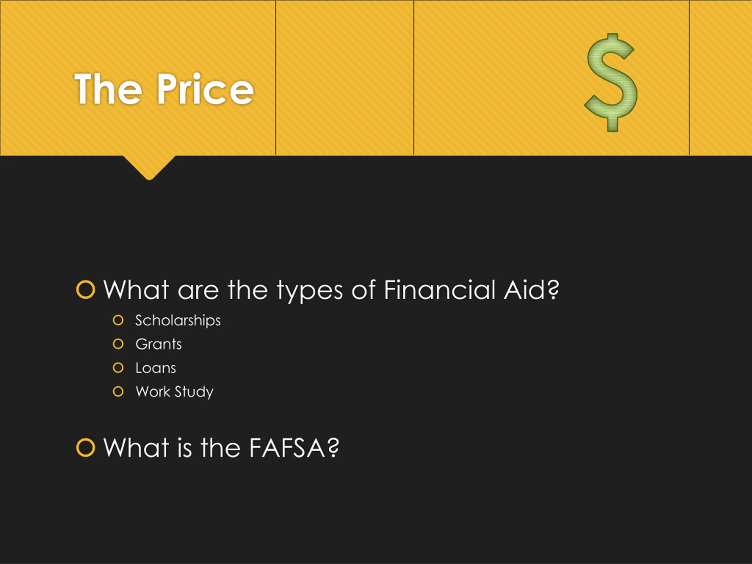 $ The Price What are the types of Financial Aid? Scholarships Grants Loans Work Study What is the FAFSA?