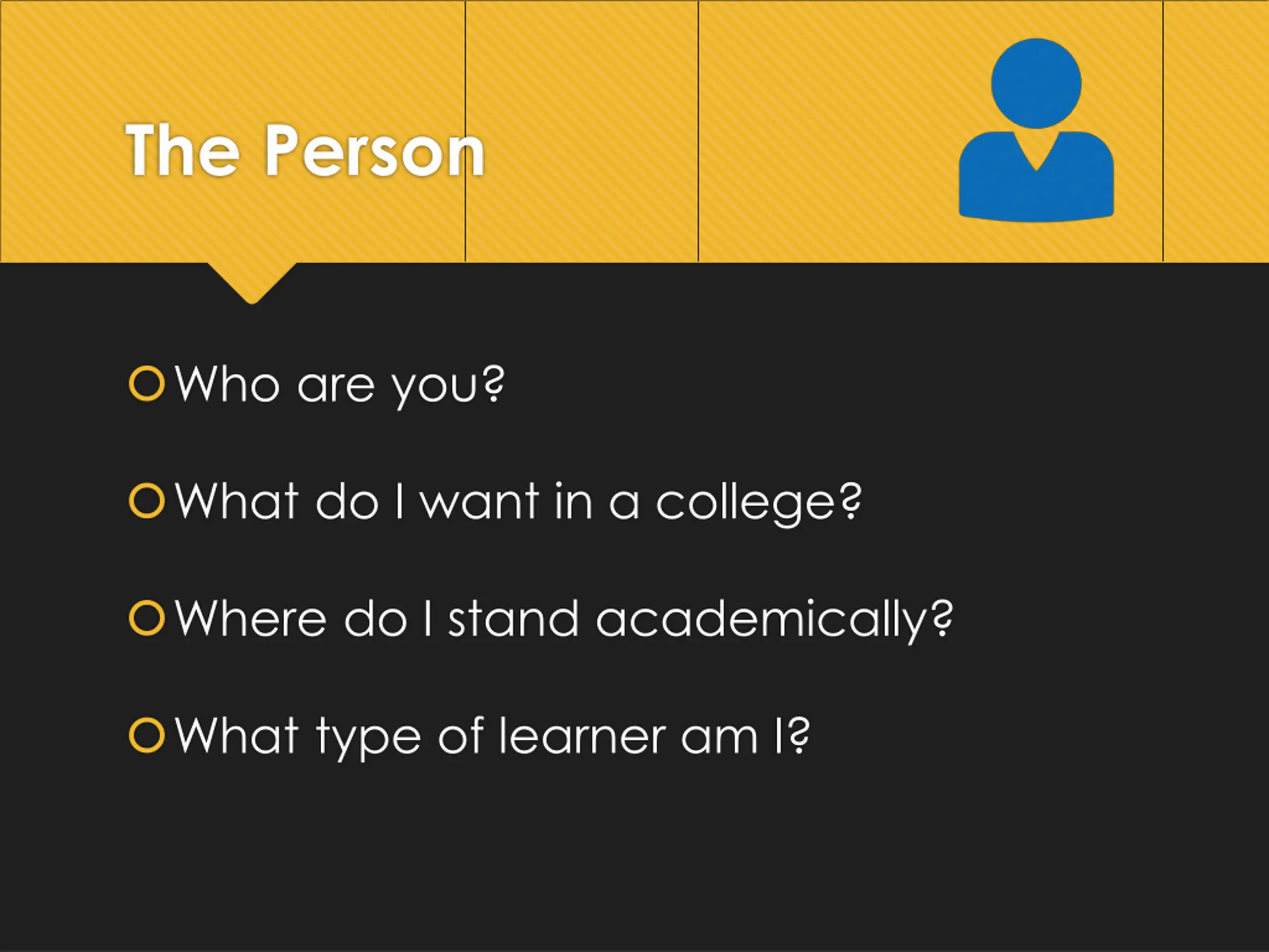 The Person Who are you? What do I want in a college? Where do I stand academically? What type of learner am I?