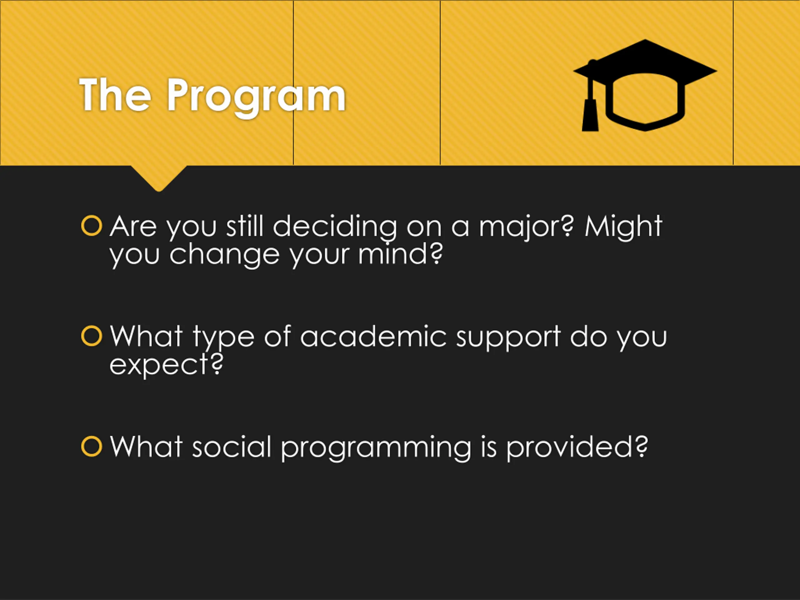 The Program Are you still deciding on a major? Might you change your mind? What type of academic support do you expect? What social programming is provided?