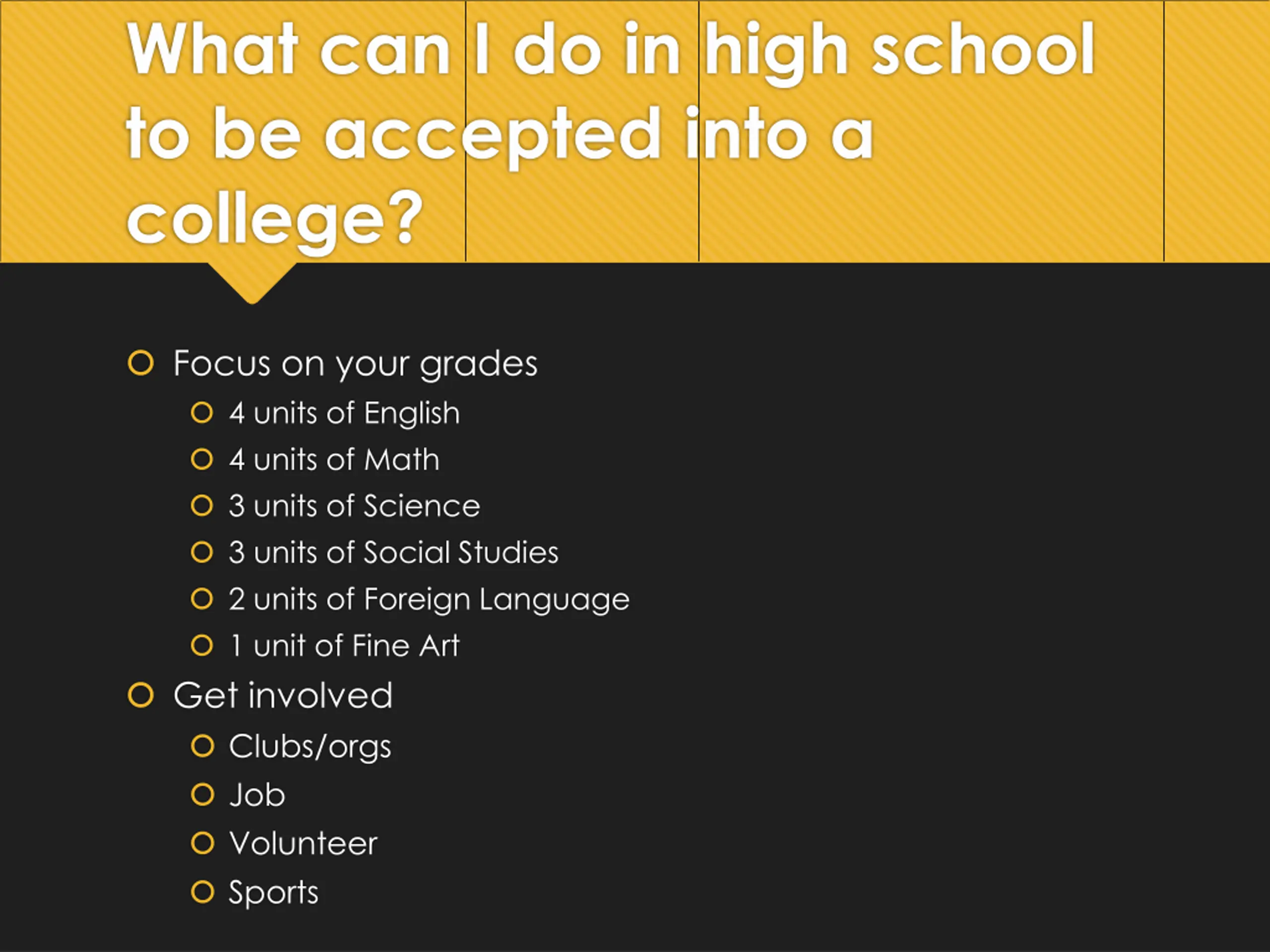 What can I do in high school to be accepted into a college? Focus on your grades 4 units of English 4 units of Math 3 units of Science 3 units of Social Studies 2 units of Foreign Language 1 unit of Fine Art Get involved Clubs/orgs Job Volunteer Sports