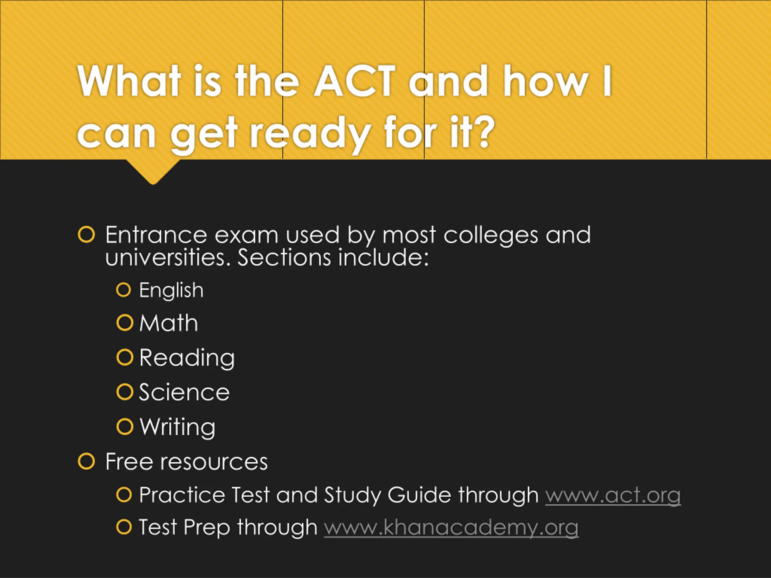 What is the ACT and how I can get ready for it? Entrance exam used by most colleges and universities. Sections include: English Math Reading Science Writing Free resources Practice Test and Study Guide through www.act.org Test Prep through www.khanacademy.org