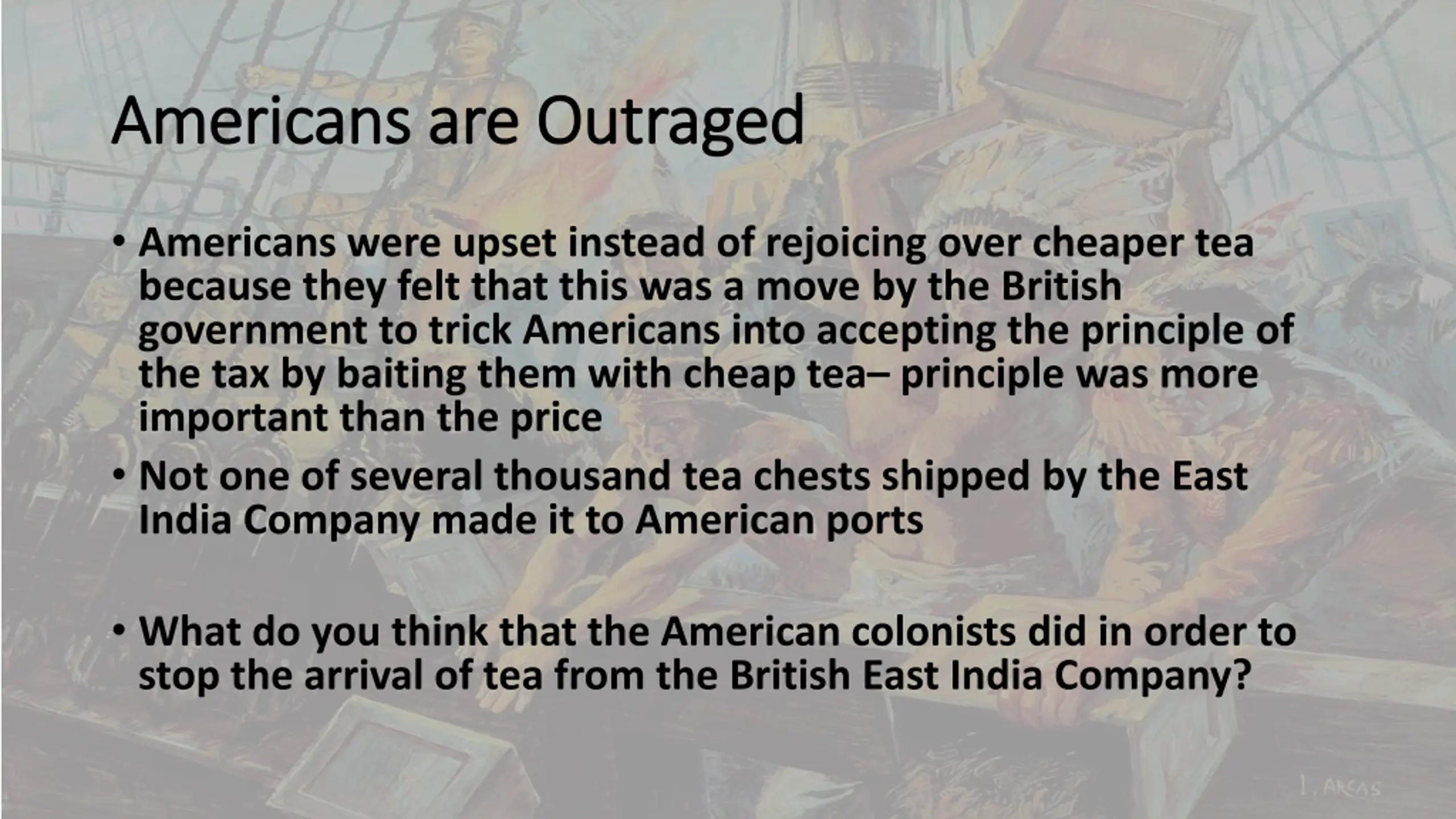 Americans are Outraged Americans are Outraged Americans were upset instead of rejoicing over cheaper tea because they felt that this was a move by the British government to trick Americans into accepting the principle of the tax by baiting them with cheap tea principle was more important than the price Not one of several thousand tea chests shipped by the East India Company made it to American ports What do you think that the American colonists did in order to stop the arrival of tea from the British East India Company?