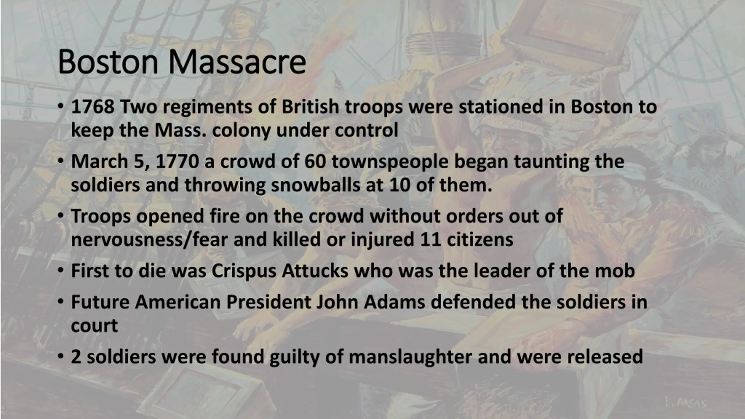 Boston Massacre Boston Massacre 1768 Two regiments of British troops were stationed in Boston to keep the Mass. colony under control March 5, 1770 a crowd of 60 townspeople began taunting the soldiers and throwing snowballs at 10 of them. Troops opened fire on the crowd without orders out of nervousness/fear and killed or injured 11 citizens First to die was Crispus Attucks who was the leader of the mob Future American President John Adams defended the soldiers in court 2 soldiers were found guilty of manslaughter and were released