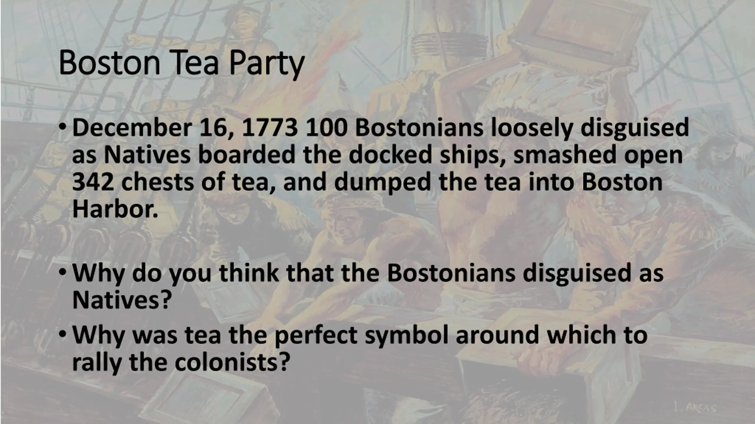 Boston Tea Party Boston Tea Party December 16, 1773 100 Bostonians loosely disguised as Natives boarded the docked ships, smashed open 342 chests of tea, and dumped the tea into Boston Harbor. Why do you think that the Bostonians disguised as Natives? Why was tea the perfect symbol around which to rally the colonists?