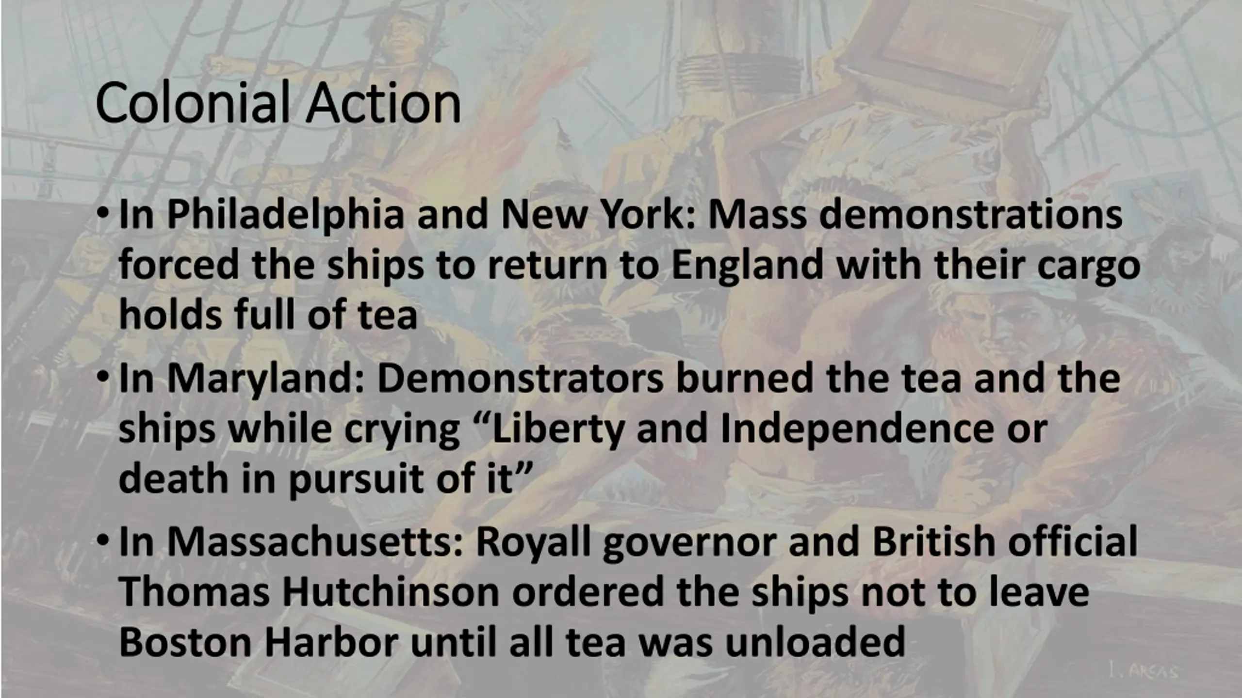 Colonial Action Colonial Action In Philadelphia and New York: Mass demonstrations forced the ships to return to England with their cargo holds full of tea In Maryland: Demonstrators burned the tea and the ships while crying Liberty and Independence or death in pursuit of it In Massachusetts: Royall governor and British official Thomas Hutchinson ordered the ships not to leave Boston Harbor until all tea was unloaded