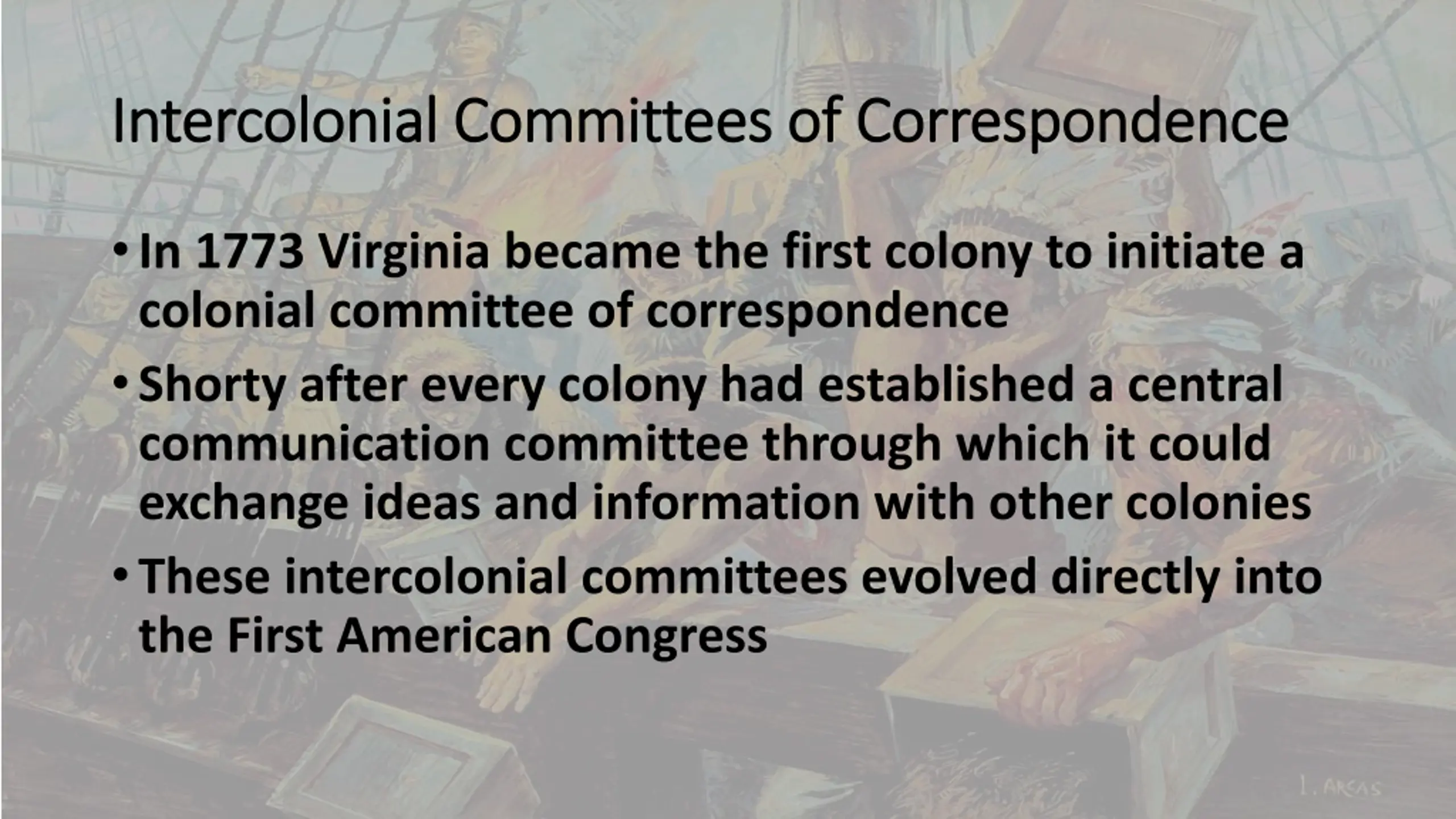 Intercolonial Committees of Correspondence Intercolonial Committees of Correspondence In 1773 Virginia became the first colony to initiate a colonial committee of correspondence Shorty after every colony had established a central communication committee through which it could exchange ideas and information with other colonies These intercolonial committees evolved directly into the First American Congress