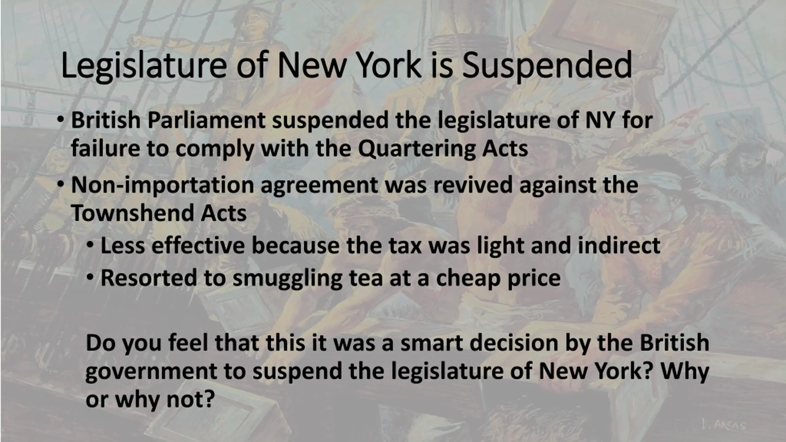 Legislature of New York is Suspended Legislature of New York is Suspended British Parliament suspended the legislature of NY for failure to comply with the Quartering Acts Non-importation agreement was revived against the Townshend Acts Less effective because the tax was light and indirect Resorted to smuggling tea at a cheap price Do you feel that this it was a smart decision by the British government to suspend the legislature of New York? Why or why not?