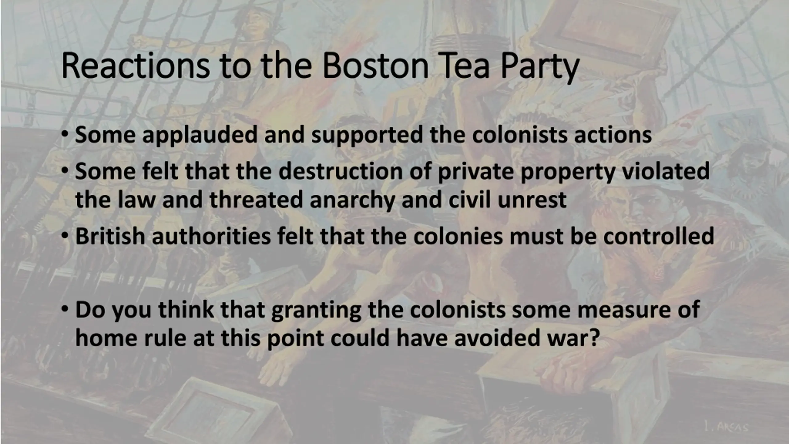 Reactions to the Boston Tea Party Reactions to the Boston Tea Party Some applauded and supported the colonists actions Some felt that the destruction of private property violated the law and threated anarchy and civil unrest British authorities felt that the colonies must be controlled Do you think that granting the colonists some measure of home rule at this point could have avoided war?