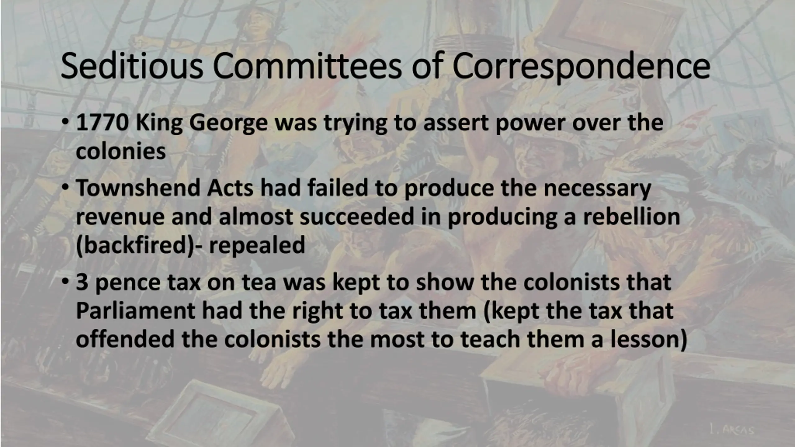 Seditious Committees of Correspondence Seditious Committees of Correspondence 1770 King George was trying to assert power over the colonies Townshend Acts had failed to produce the necessary revenue and almost succeeded in producing a rebellion (backfired)- repealed 3 pence tax on tea was kept to show the colonists that Parliament had the right to tax them (kept the tax that offended the colonists the most to teach them a lesson)