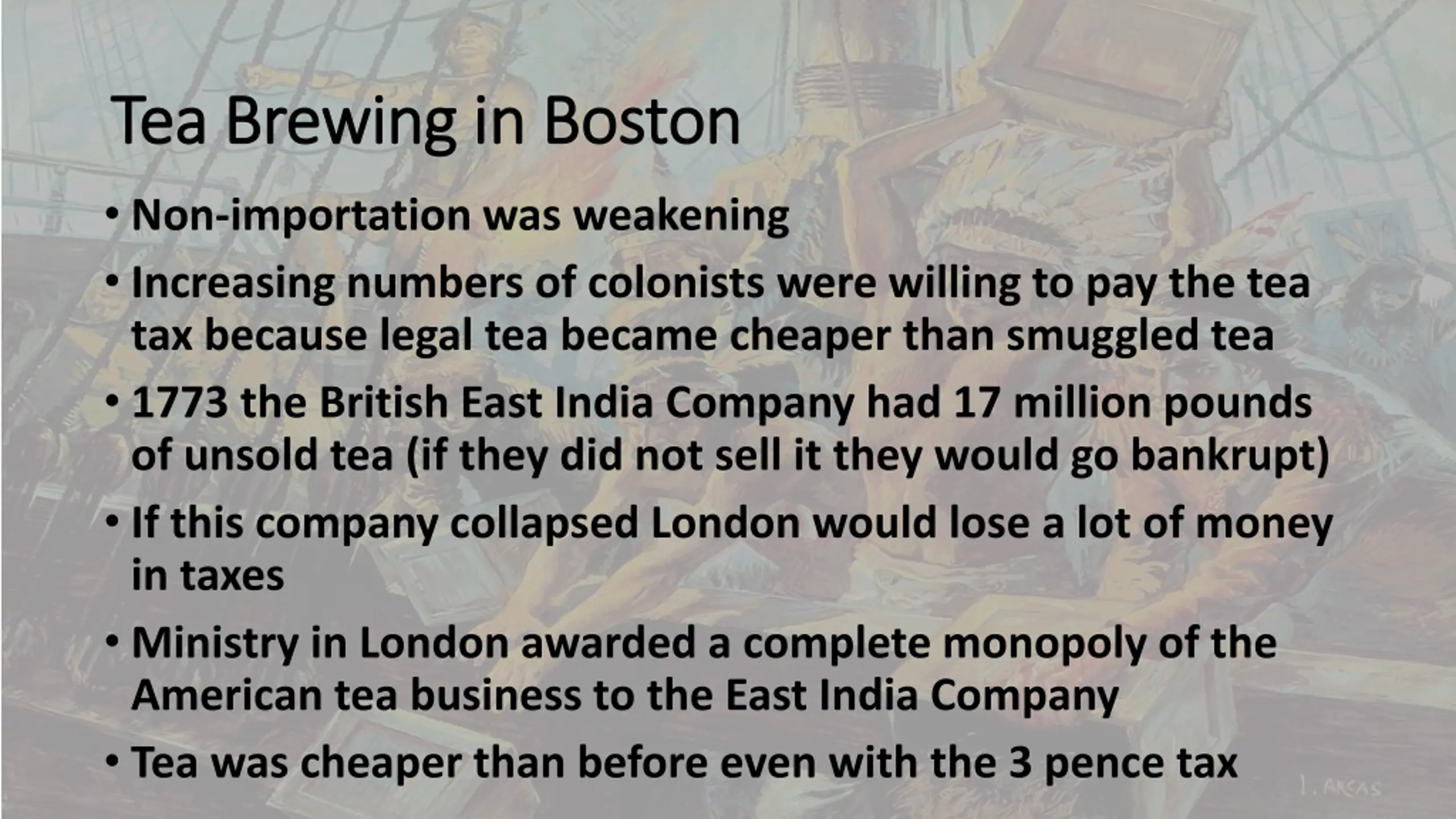 Tea Brewing in Boston Tea Brewing in Boston Non-importation was weakening Increasing numbers of colonists were willing to pay the tea tax because legal tea became cheaper than smuggled tea 1773 the British East India Company had 17 million pounds of unsold tea (if they did not sell it they would go bankrupt) If this company collapsed London would lose a lot of money in taxes Ministry in London awarded a complete monopoly of the American tea business to the East India Company Tea was cheaper than before even with the 3 pence tax