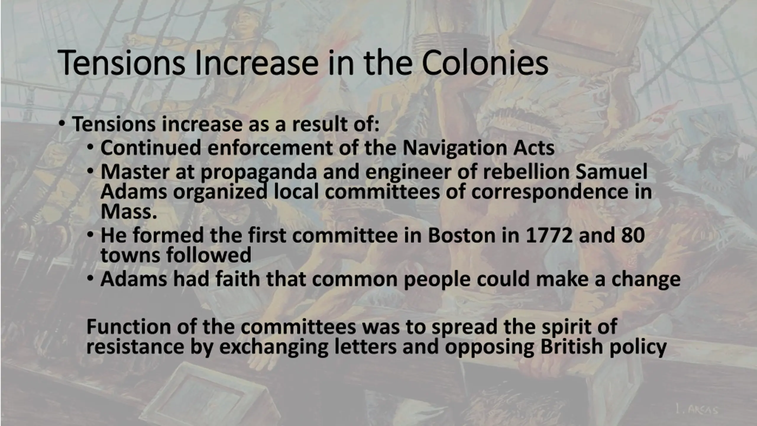 Tensions Increase in the Colonies Tensions Increase in the Colonies Tensions increase as a result of: Continued enforcement of the Navigation Acts Master at propaganda and engineer of rebellion Samuel Adams organized local committees of correspondence in Mass. He formed the first committee in Boston in 1772 and 80 towns followed Adams had faith that common people could make a change Function of the committees was to spread the spirit of resistance by exchanging letters and opposing British policy