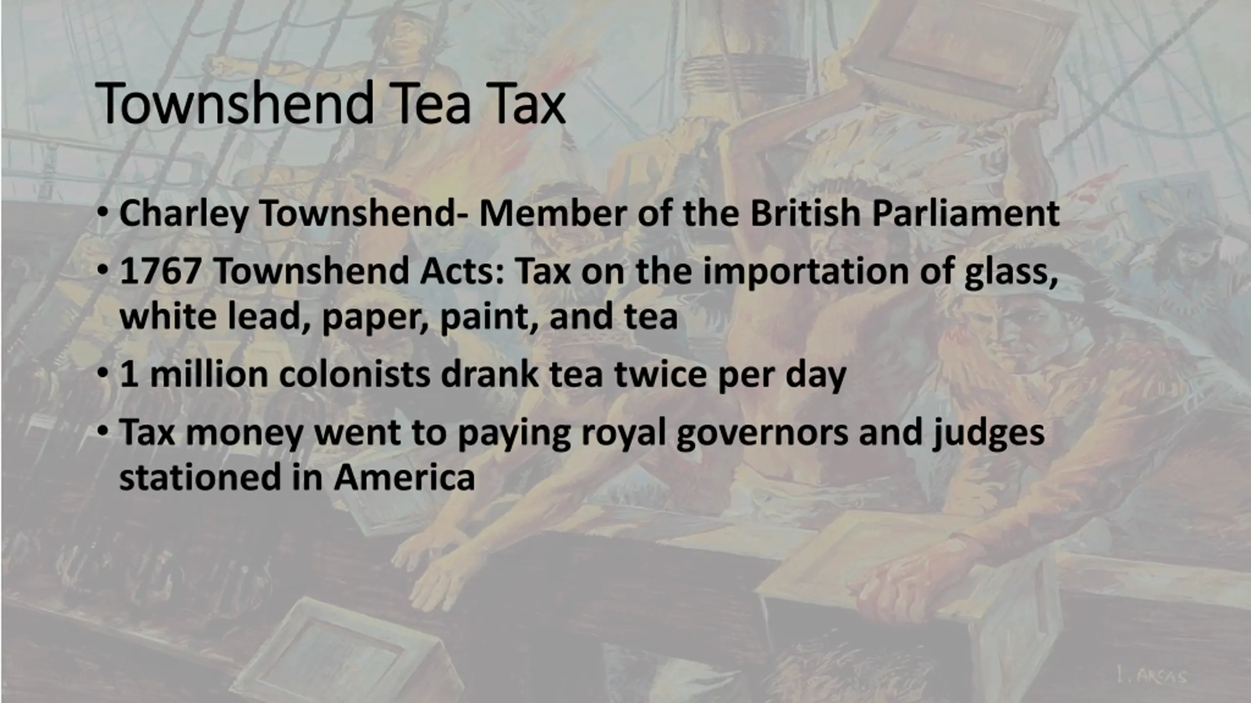 Townshend Tea Tax Townshend Tea Tax Charley Townshend- Member of the British Parliament 1767 Townshend Acts: Tax on the importation of glass, white lead, paper, paint, and tea 1 million colonists drank tea twice per day Tax money went to paying royal governors and judges stationed in America