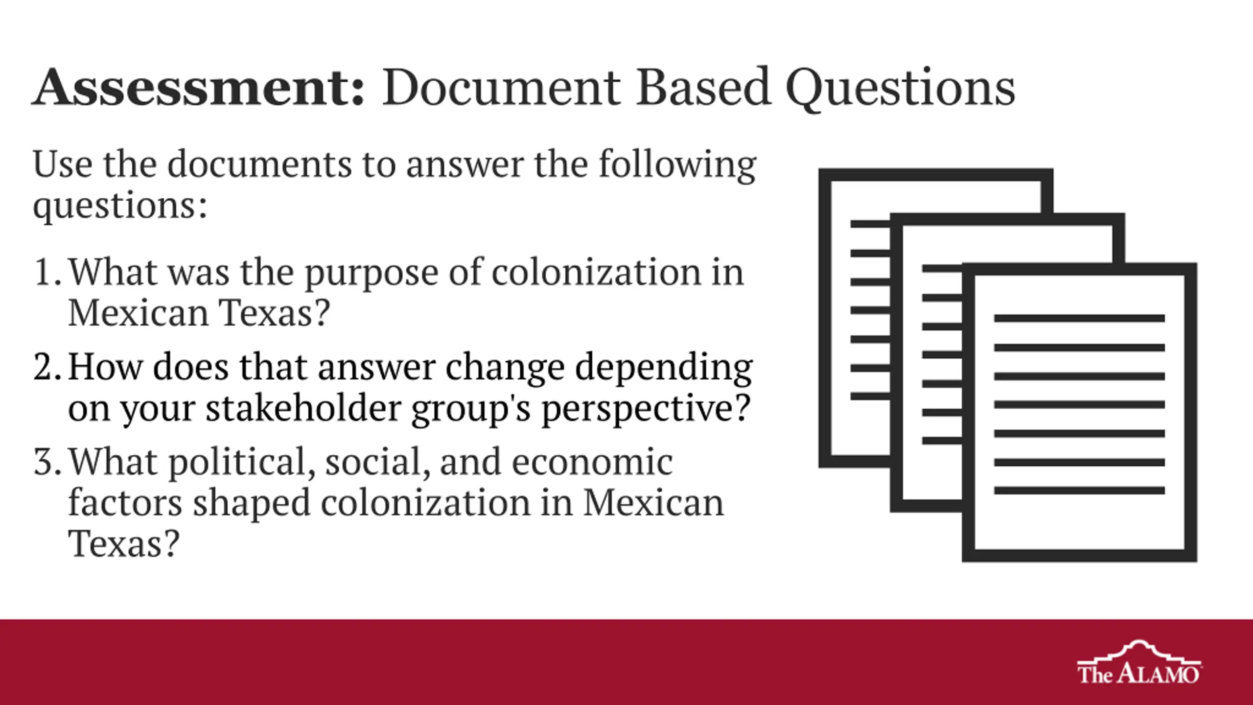 Assessment: Document Based Questions Use the documents to answer the following questions: 1.What was the purpose of colonization in Mexican Texas? 2.How does that answer change depending on your stakeholder group's perspective? 3.What political, social, and economic factors shaped colonization in Mexican Texas?