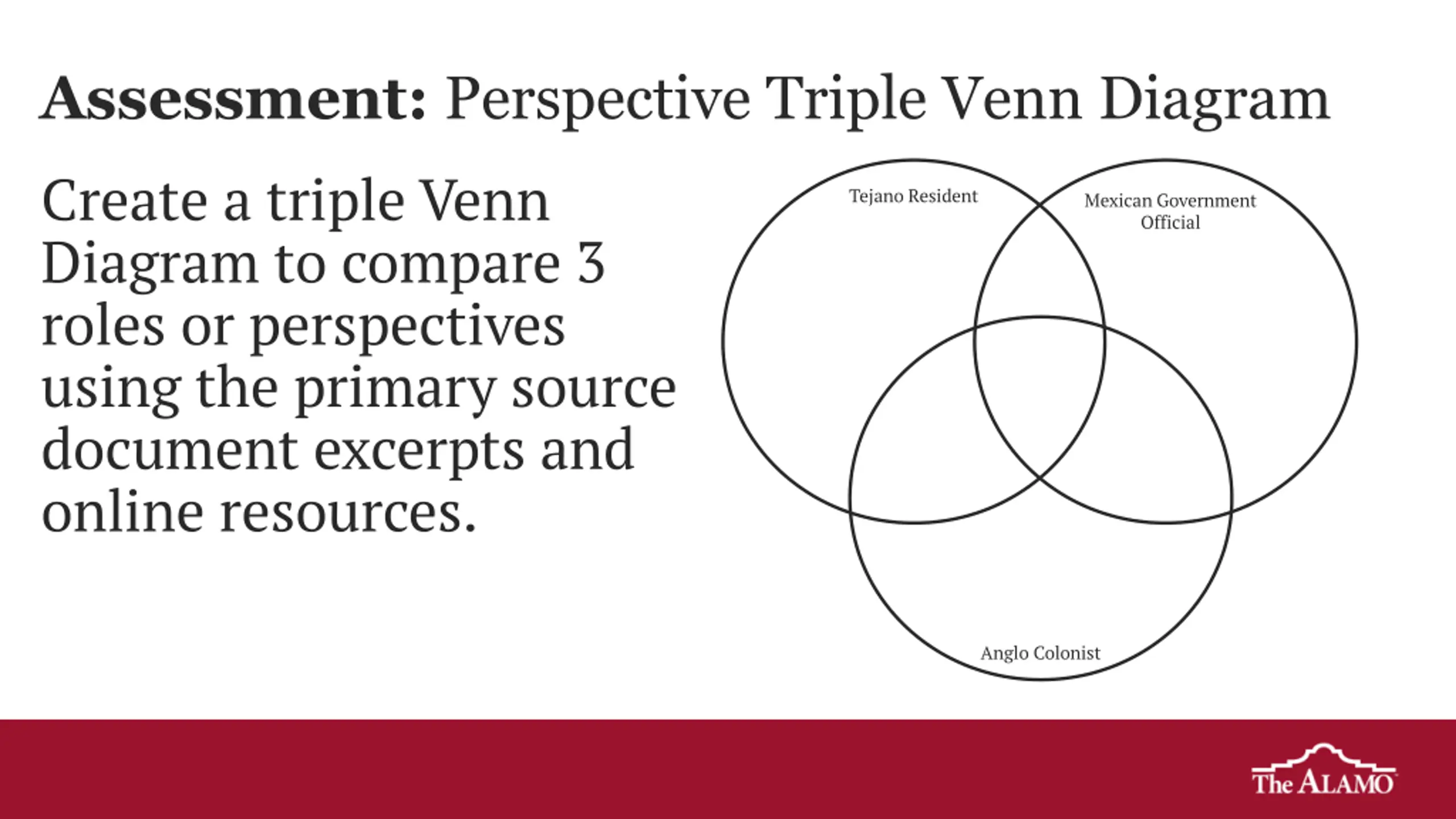 Assessment: Perspective Triple Venn Diagram Create a triple Venn Diagram to compare 3 roles or perspectives using the primary source document excerpts and online resources. Tejano Resident Mexican Government Official Anglo Colonist