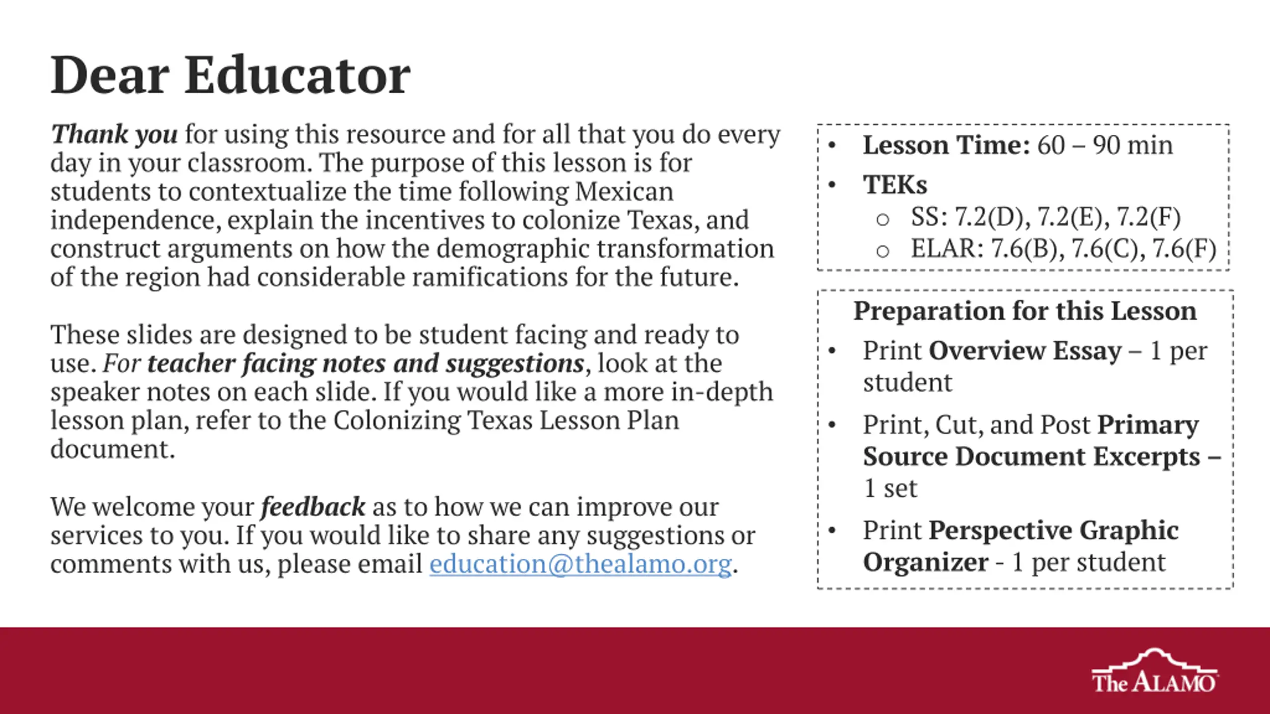 Dear Educator Thank you for using this resource and for all that you do every day in your classroom. The purpose of this lesson is for students to contextualize the time following Mexican independence, explain the incentives to colonize Texas, and construct arguments on how the demographic transformation of the region had considerable ramifications for the future. Lesson Time: 60 90 min TEKs o SS: 7.2(D),7.2(E), 7.2(F) o ELAR: 7.6(B),7.6(C),7.6(F) Preparation for this Lesson Print Overview Essay 1 per student Print, Cut, and Post Primary Source Document Excerpts 1 set Print Perspective Graphic Organizer - 1 per student These slides are designed to be student facing and ready to use. For teacher facing notes and suggestions, look at the speaker notes on each slide. If you would like a more in-depth lesson plan, refer to the Colonizing Texas Lesson Plan document. We welcome your feedback as to how we can improve our services to you. If you would like to share any suggestions or comments with us, please email education@thealamo.org.