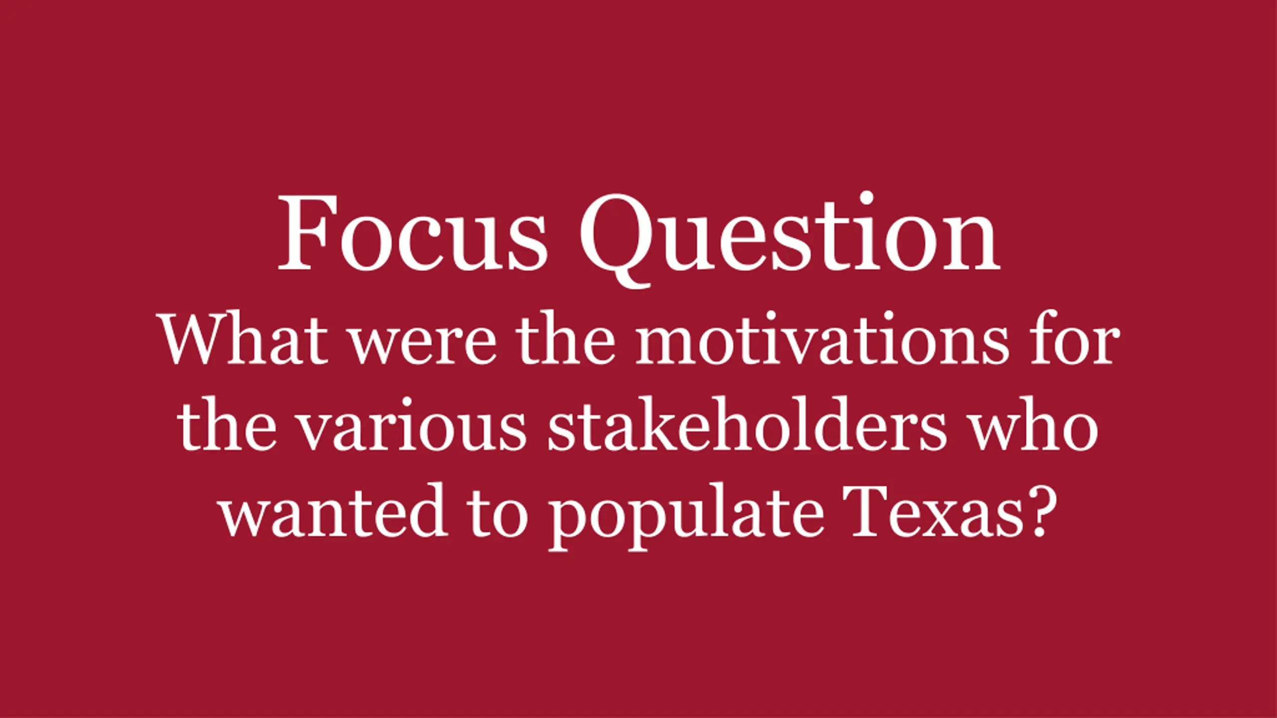 Focus Question What were the motivations for the various stakeholders who wanted to populate Texas?